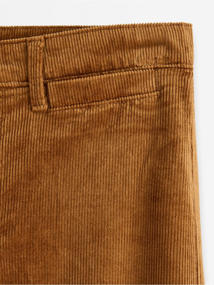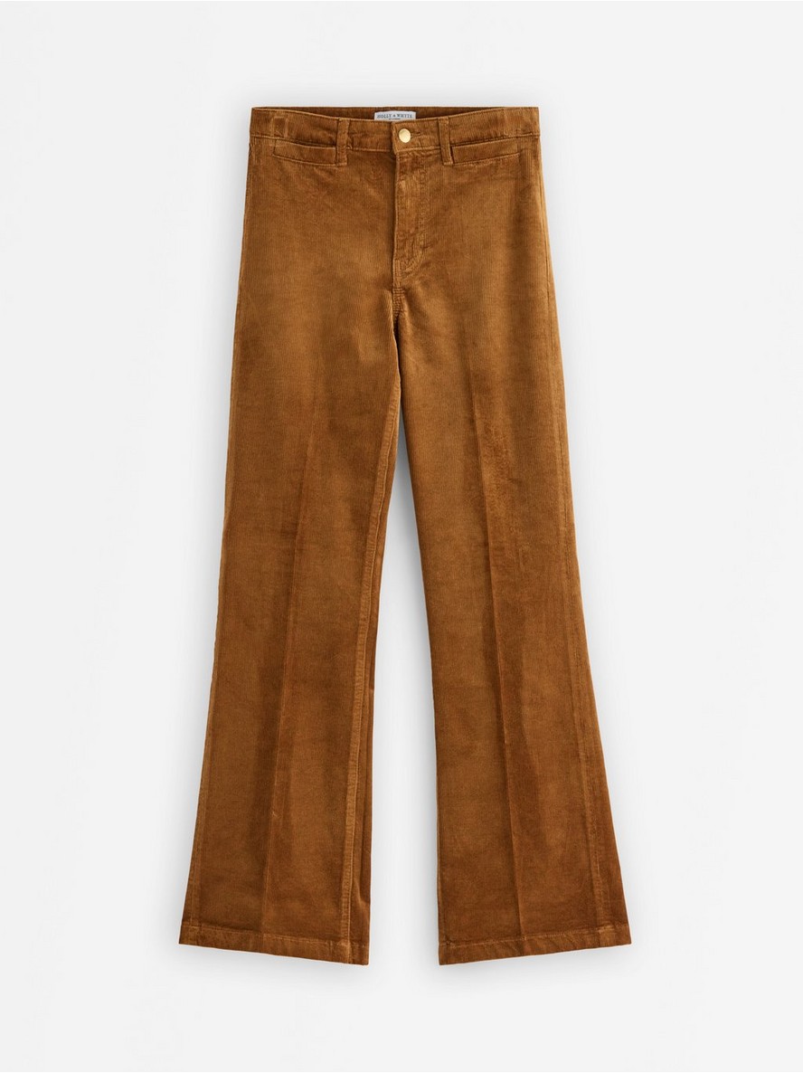 Moderne kordurojne pantalone sa visokim strukom i širokim nogavicama sa naborima.
