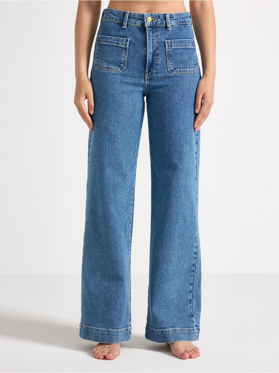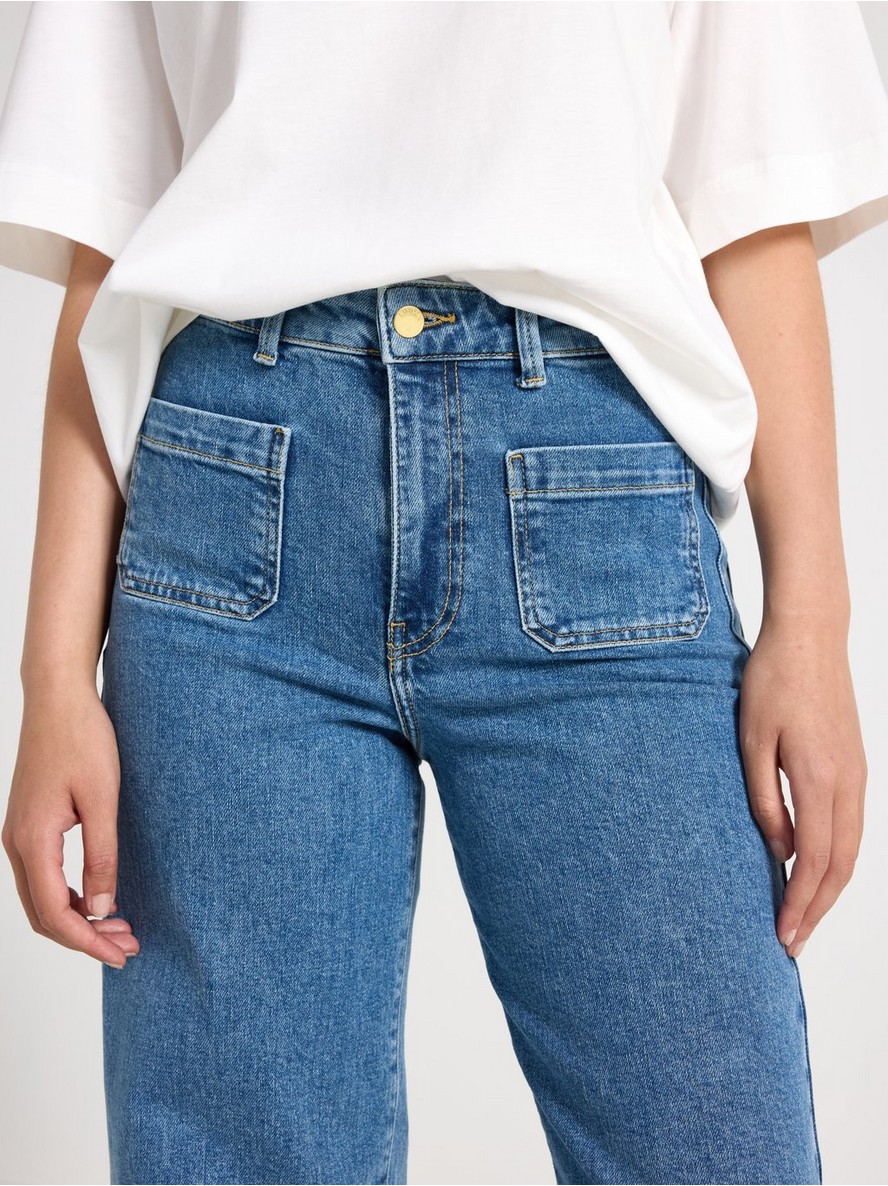 Farmerke sa visokim strukom od pamučnog denima sa blagom rastegljivošću i ekstra širokim nogavicama.