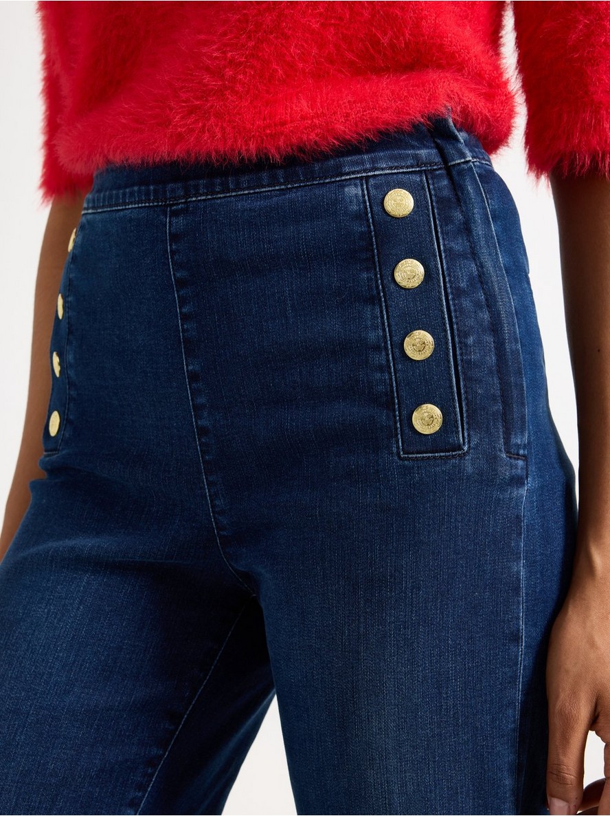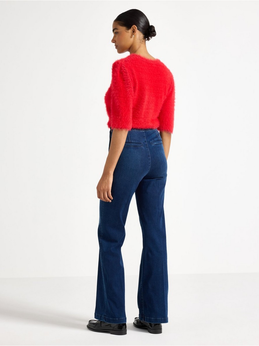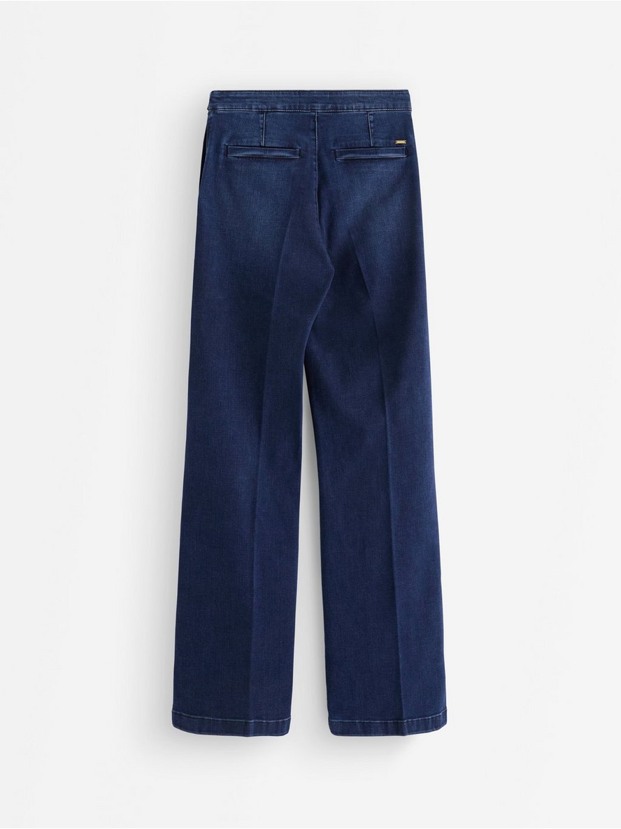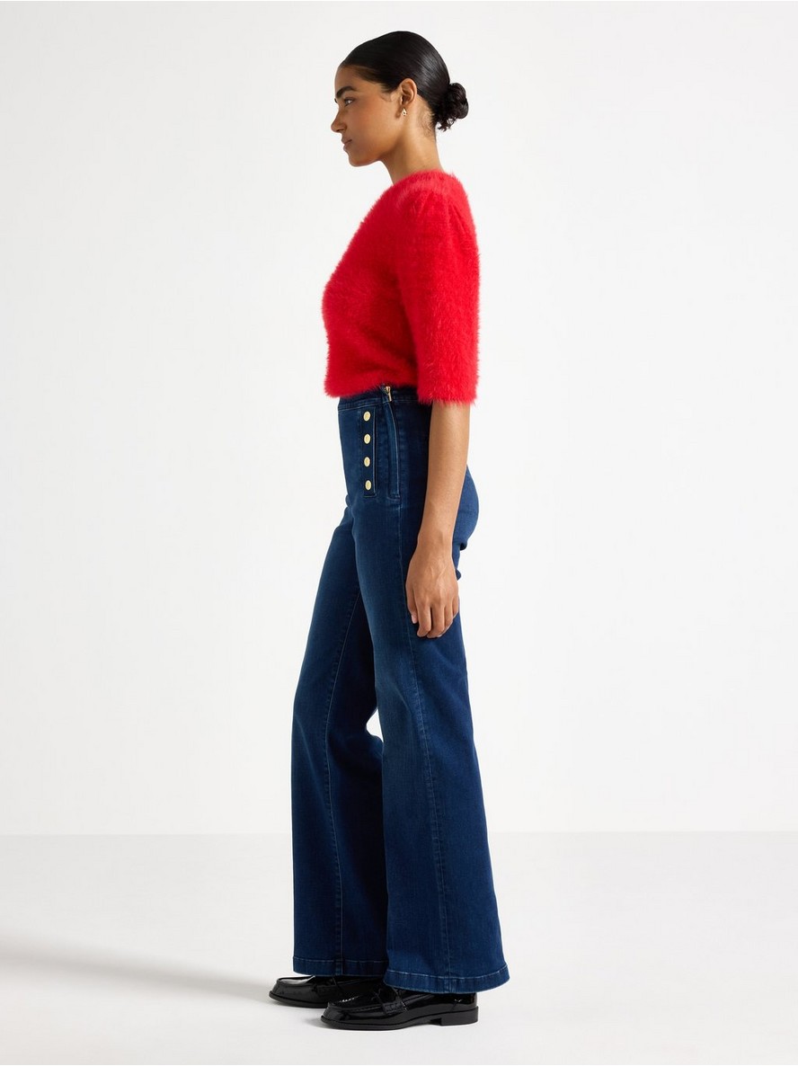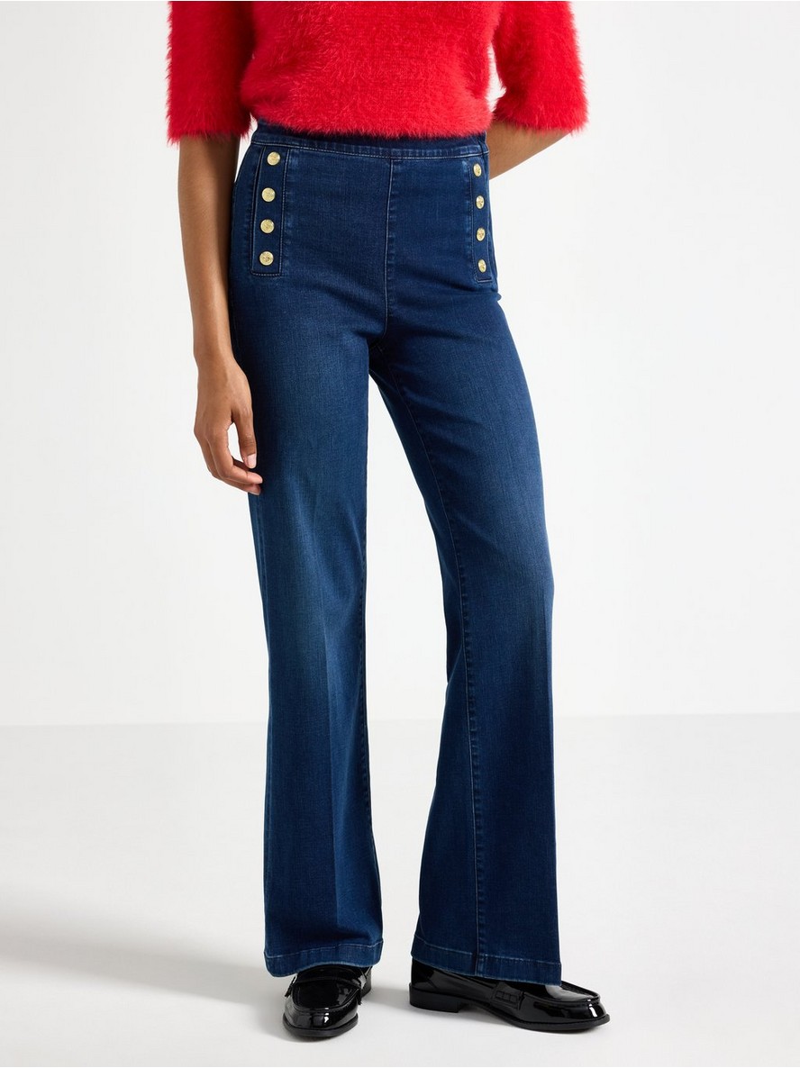 Farmerke visokog struka sa zvonastim nogavicama, od pamučnog teksasa sa superstrečom. Ove farmerke imaju bočni rajsferšlus i zlatno obojena dugmad sprijeda.