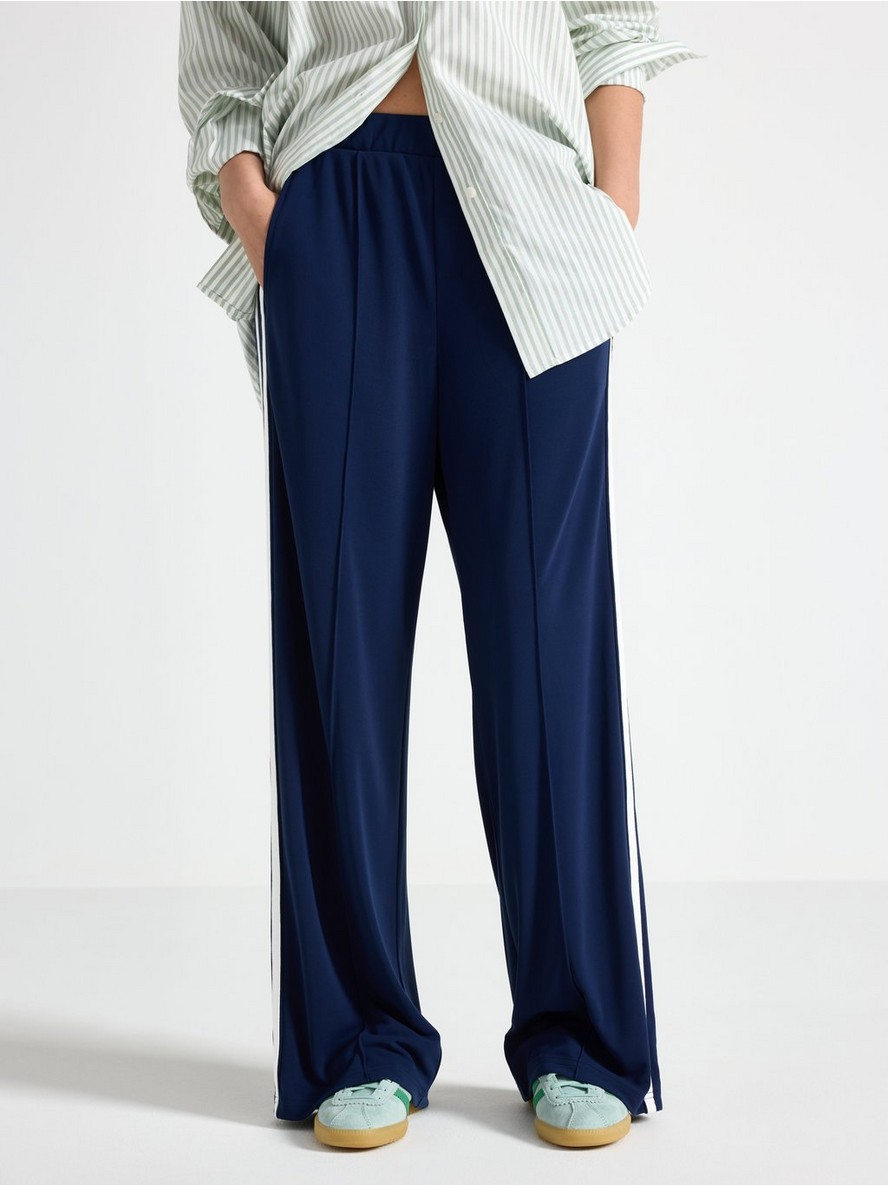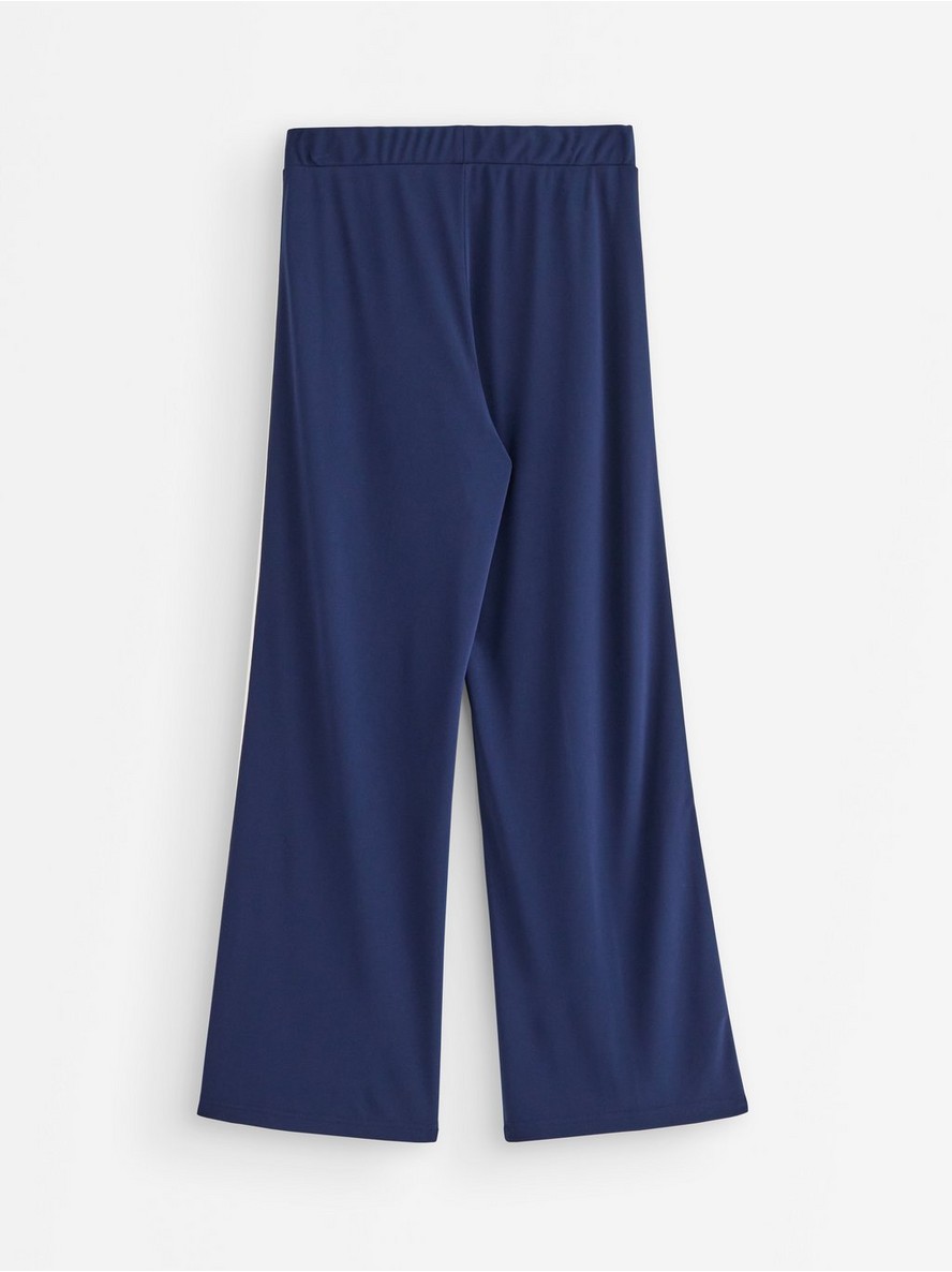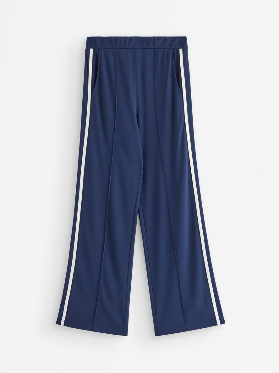 Opuštene džersej pantalone sa sportskim dizajnom koje imaju kontrastne pruge sa strane, široke nogavice i udoban elastični struk.