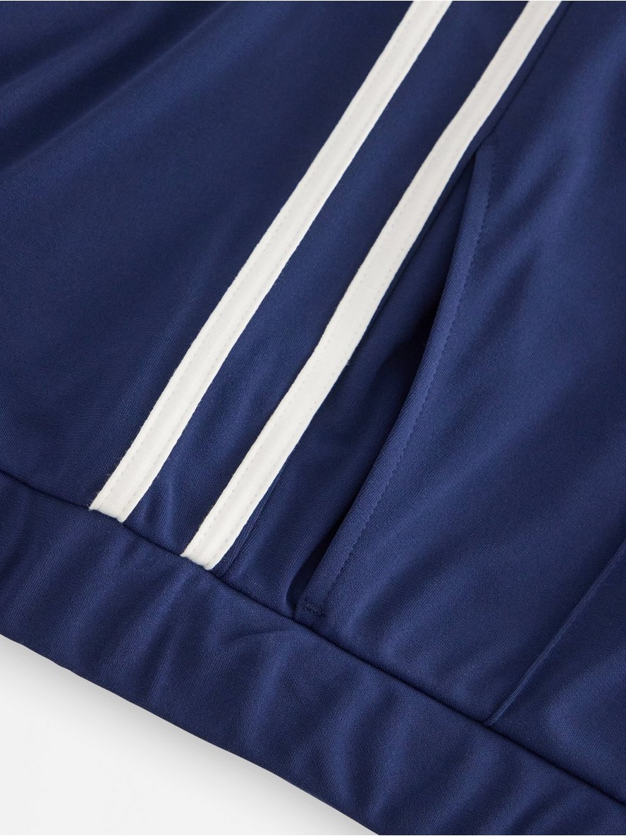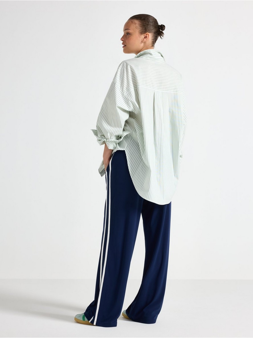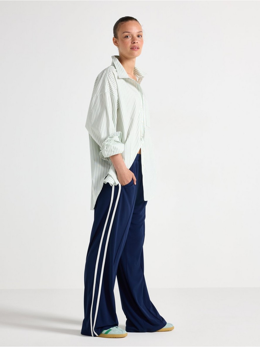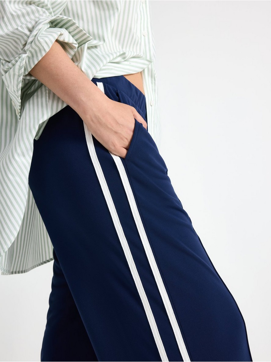 Opuštene džersej pantalone sa sportskim dizajnom koje imaju kontrastne pruge sa strane, široke nogavice i udoban elastični struk.