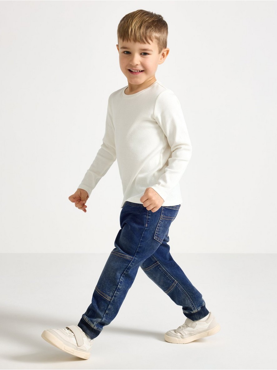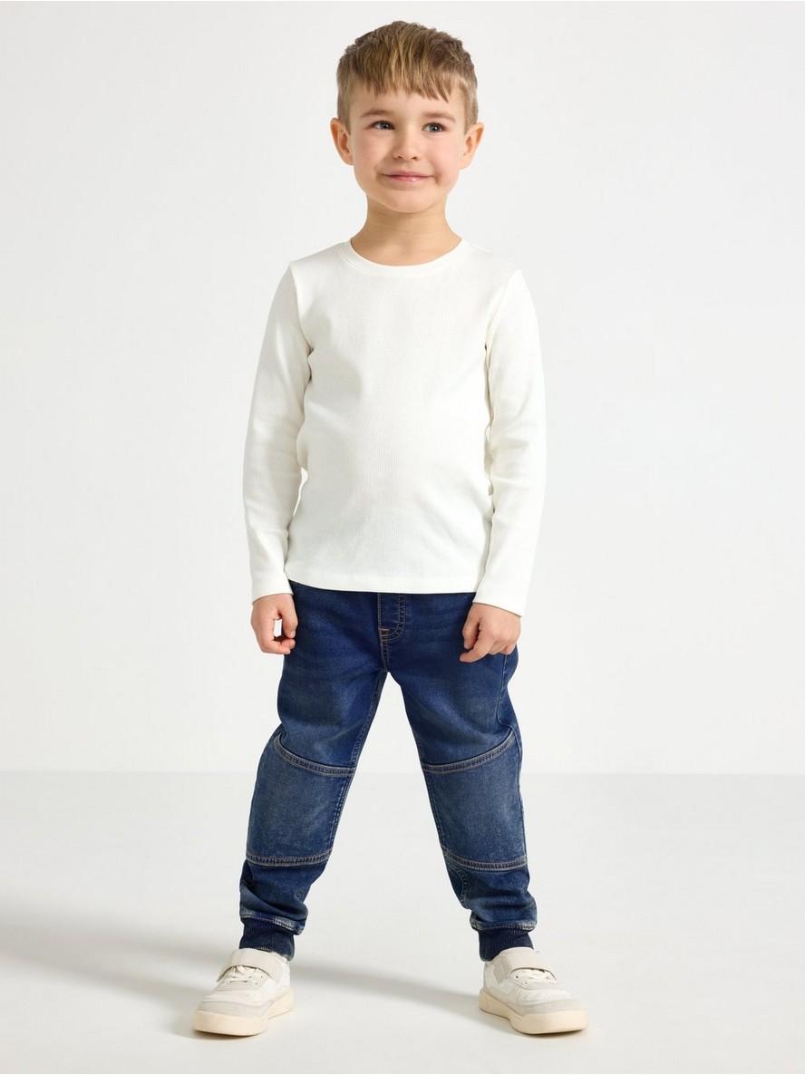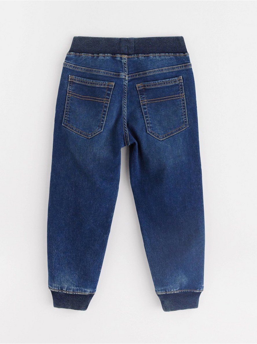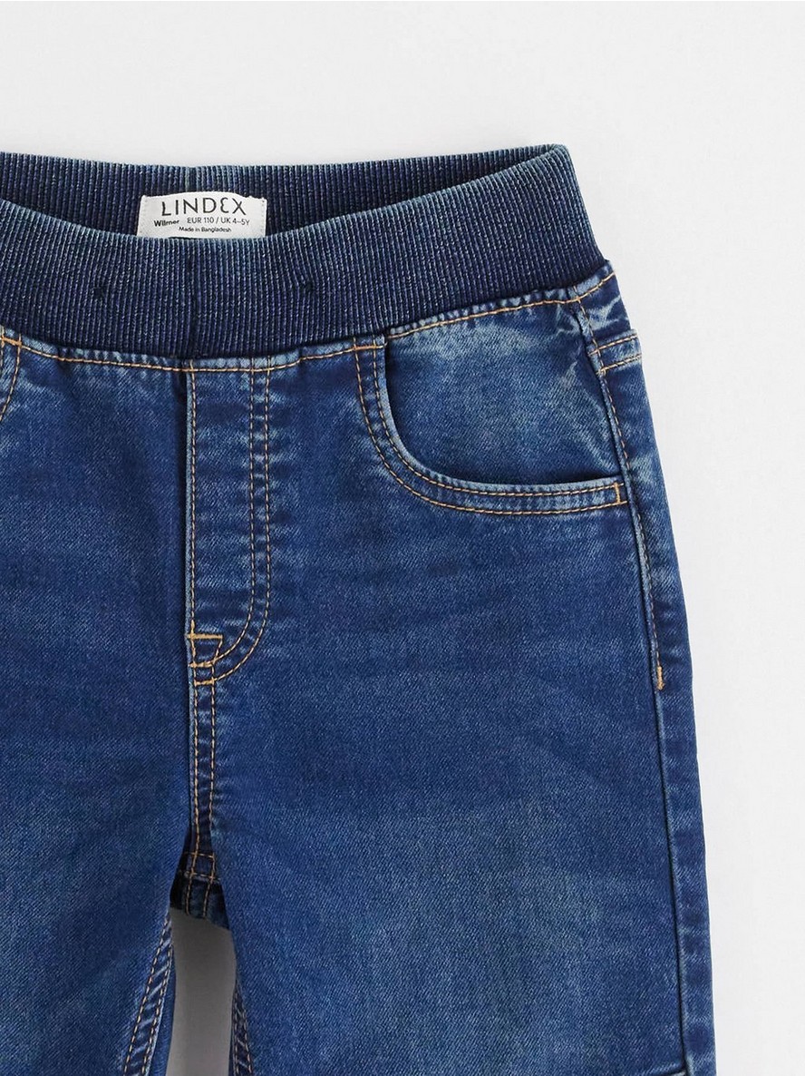 Komforne i rastegljive farmerke na navlačenje od mekanog denim džerseja sa širokom, suženom nogavicom, elastičnim strukom i rebrastim manžetnama. Kolena su ojačana dvostrukim slojem tkanine.