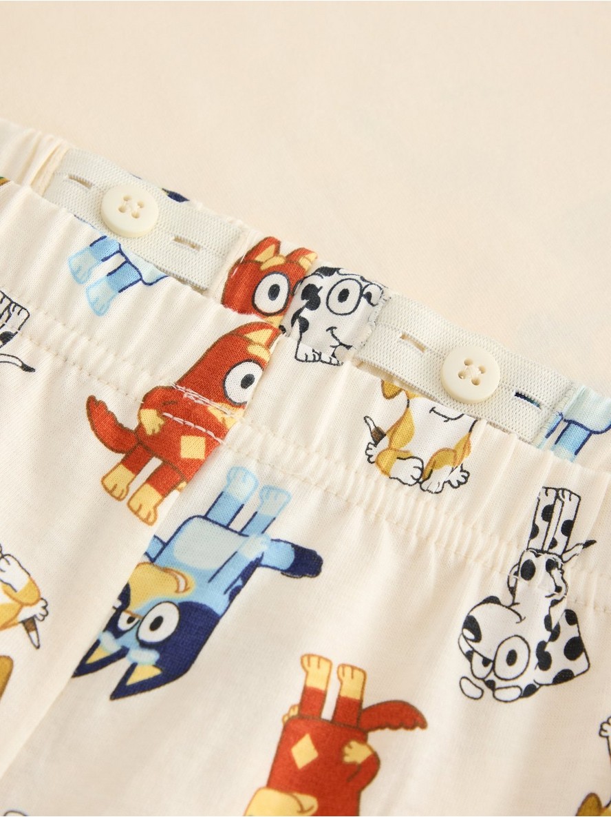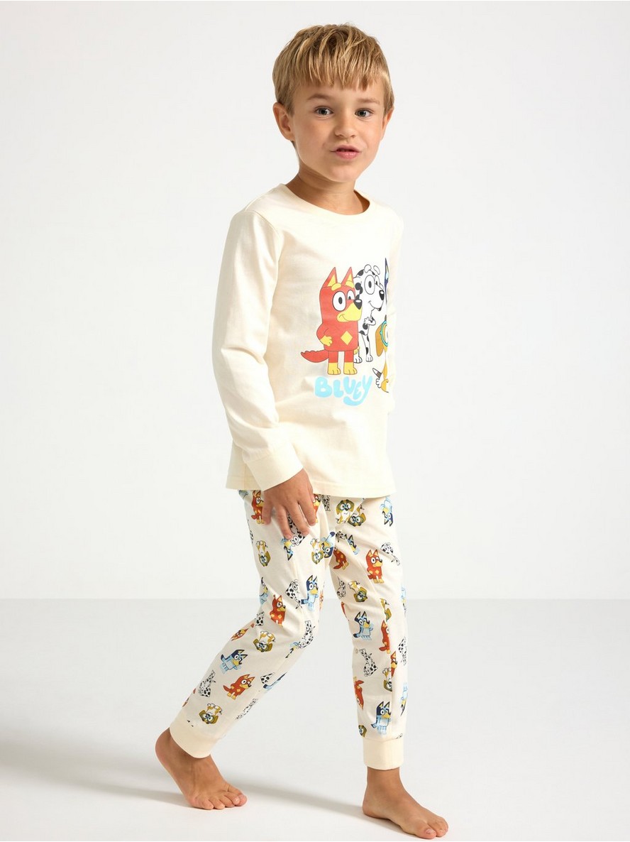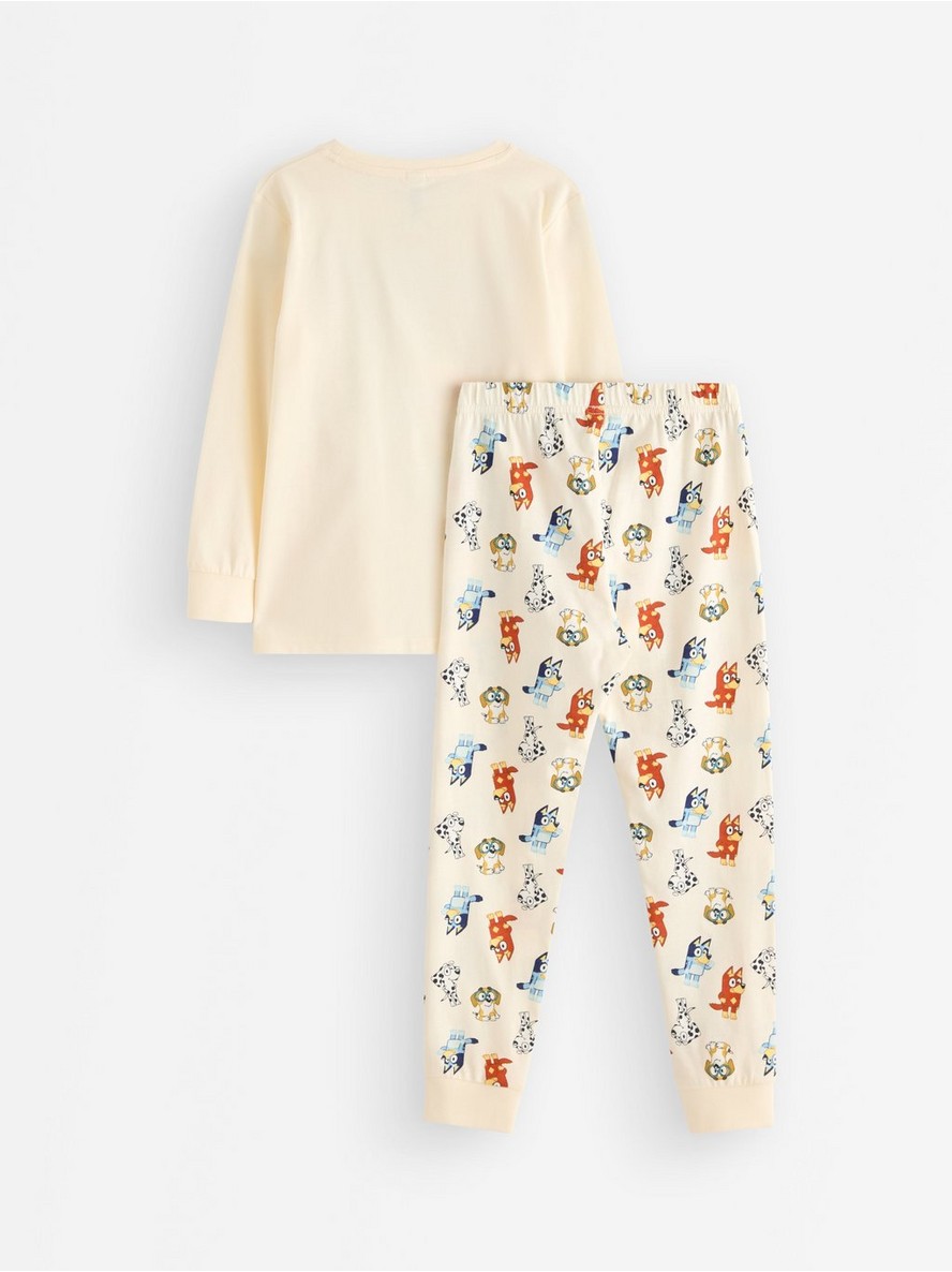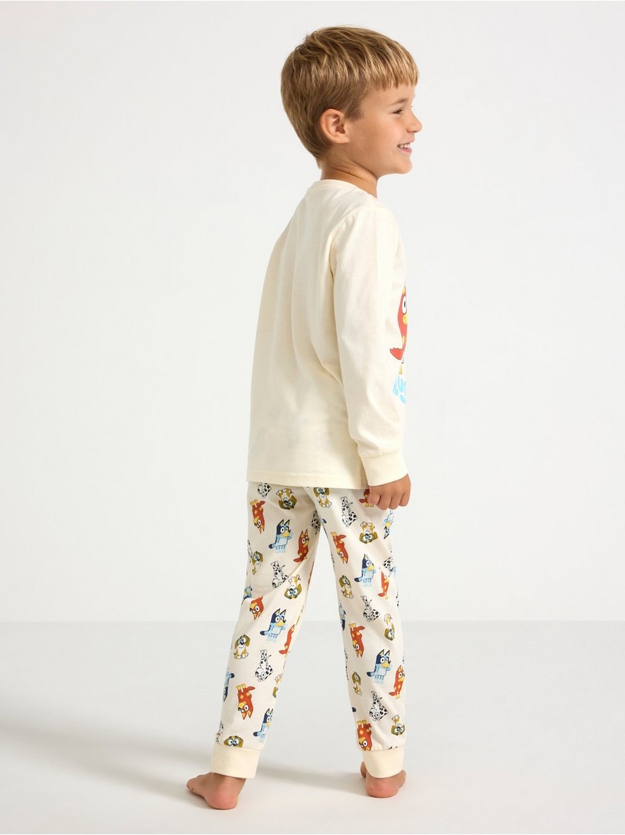 Udoban set pidžame od mekog pamučnog džerseja, sa majicom dugih rukava i pantalonama sa podesivim, elastičnim strukom.