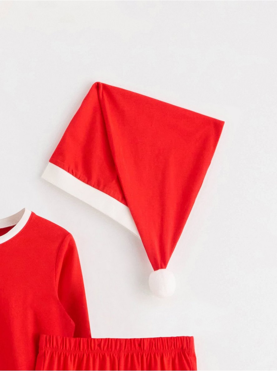 Udoban komplet pidžame koji uključuje majicu sa dugim rukavima, odgovarajuće pantalone i kapu.