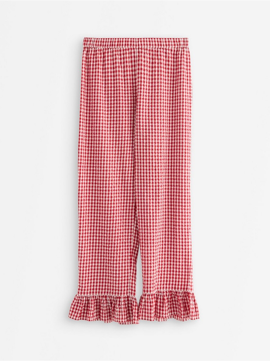 Pidžama pantalone od mekanog seersucker materijala, opuštenog kroja, sa volanima na donjem delu nogavica.