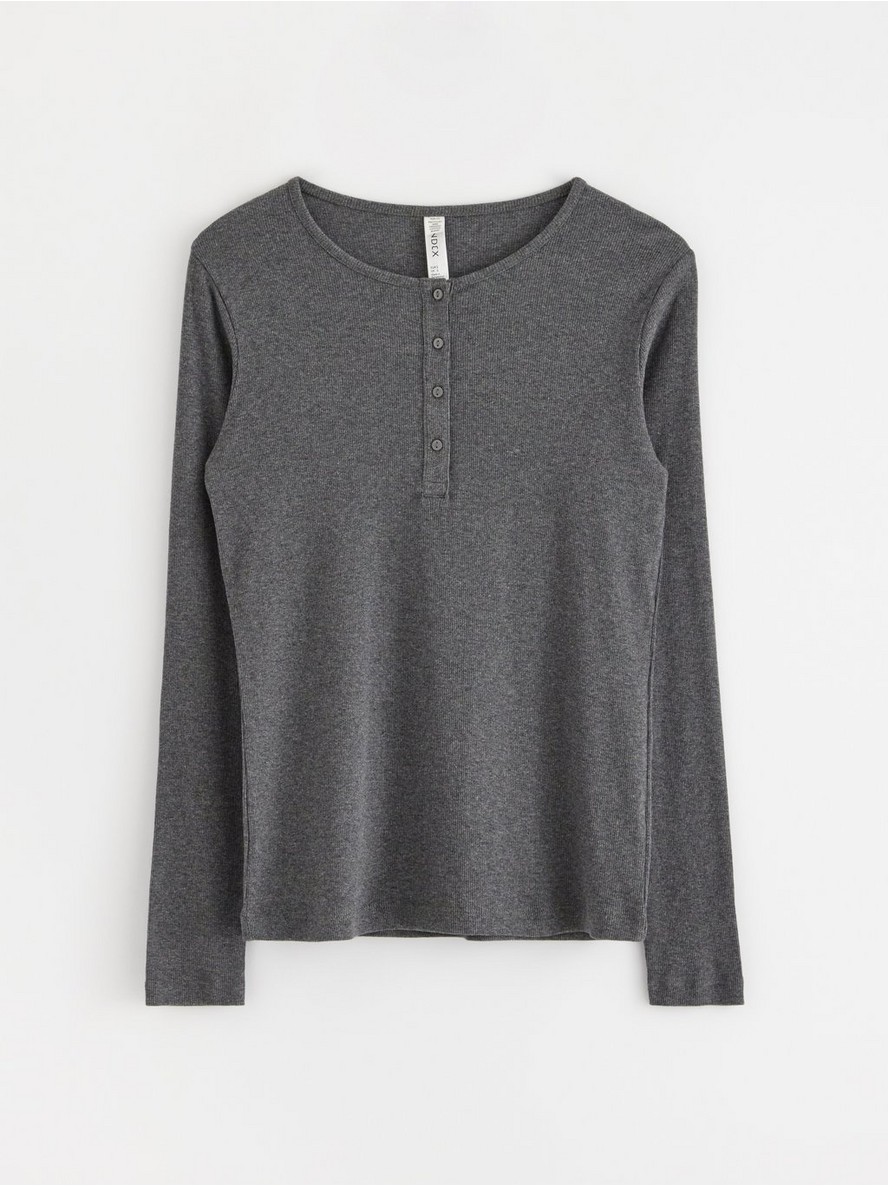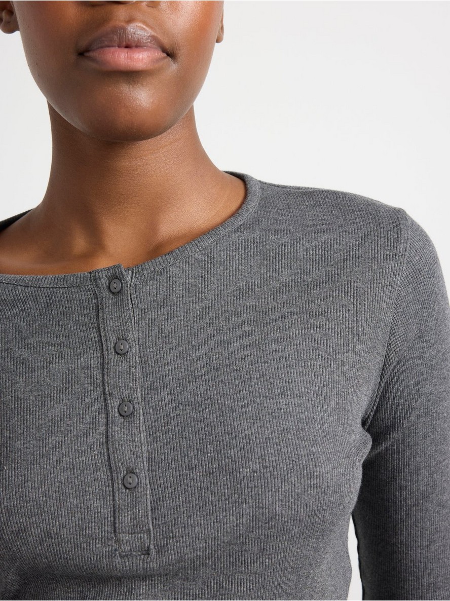 ONLINE IZDANJE. Meki, rebrasti top dugih rukava sa prednjim preklopom sa dugmadima.
