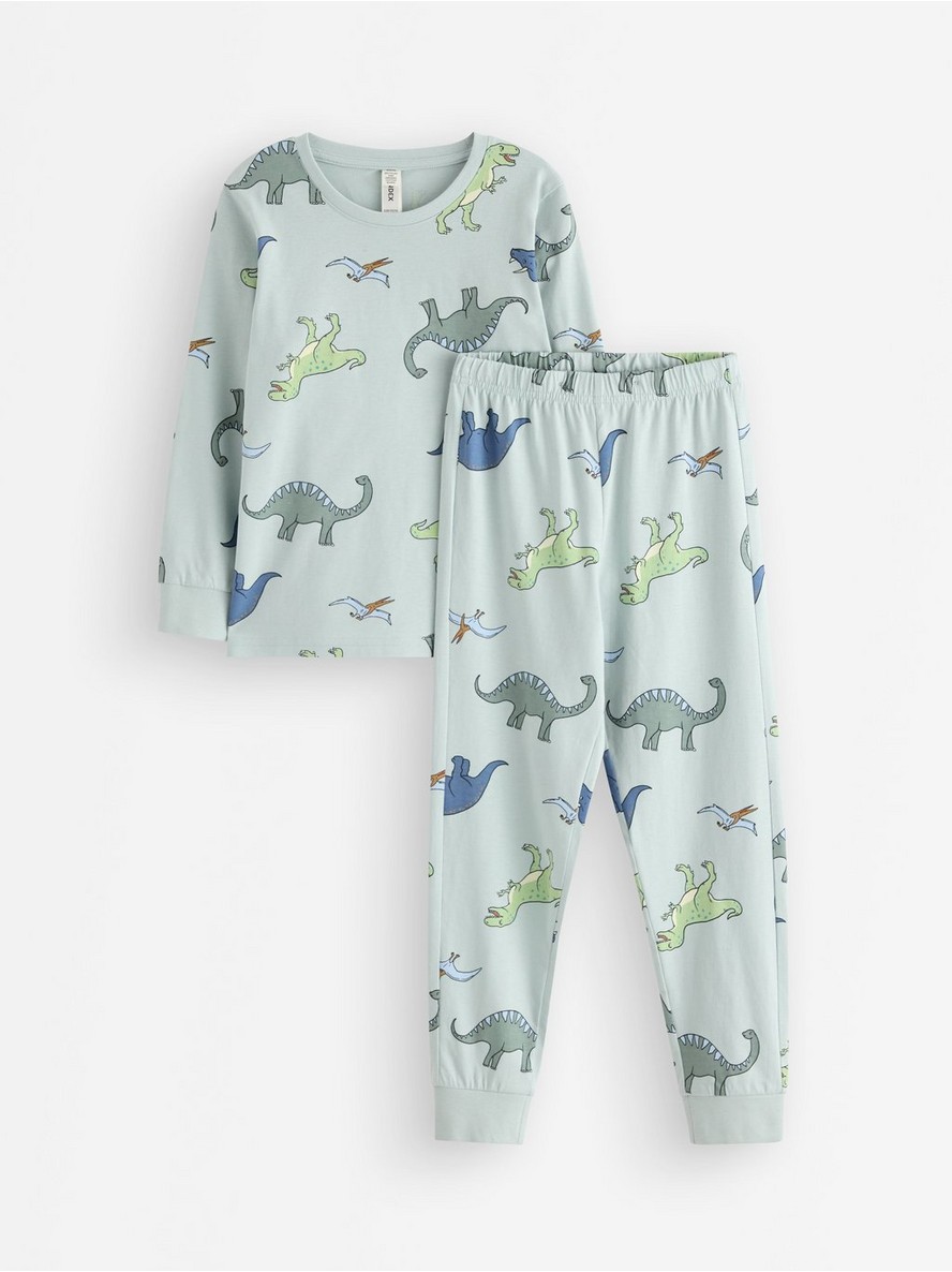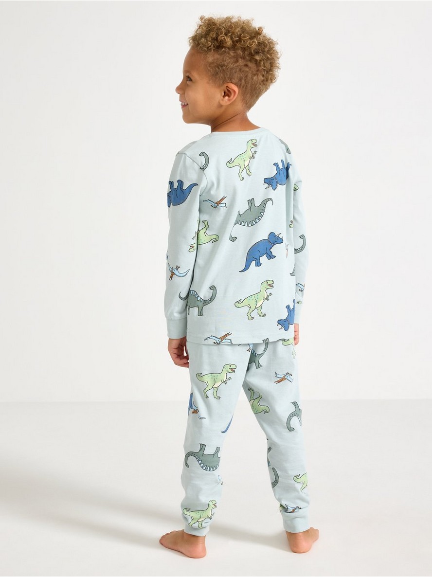 Udoban komplet pidžame od mekanog pamučnog džerseja, sa gornjim delom dugih rukava i pantalonama sa podesivim elastičnim strukom.