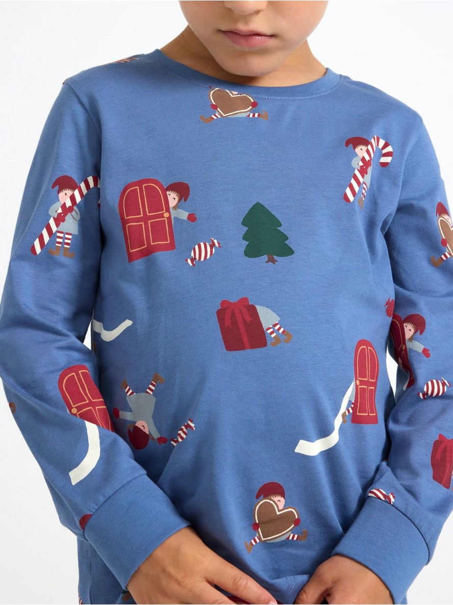 Udoban komplet pidžame od mekanog pamučnog džerseja, sa majicom dugih rukava i pantalonama sa podesivim elastičnim pojasom.