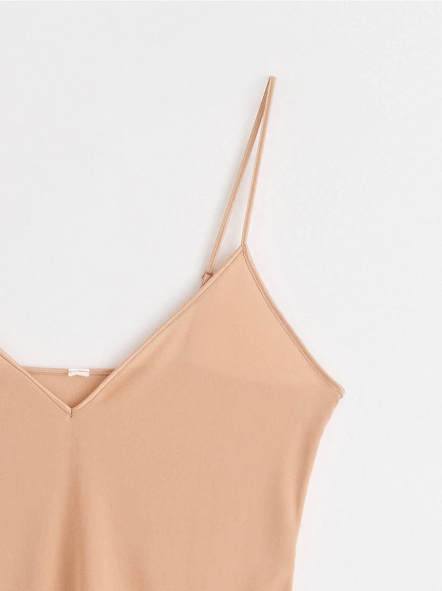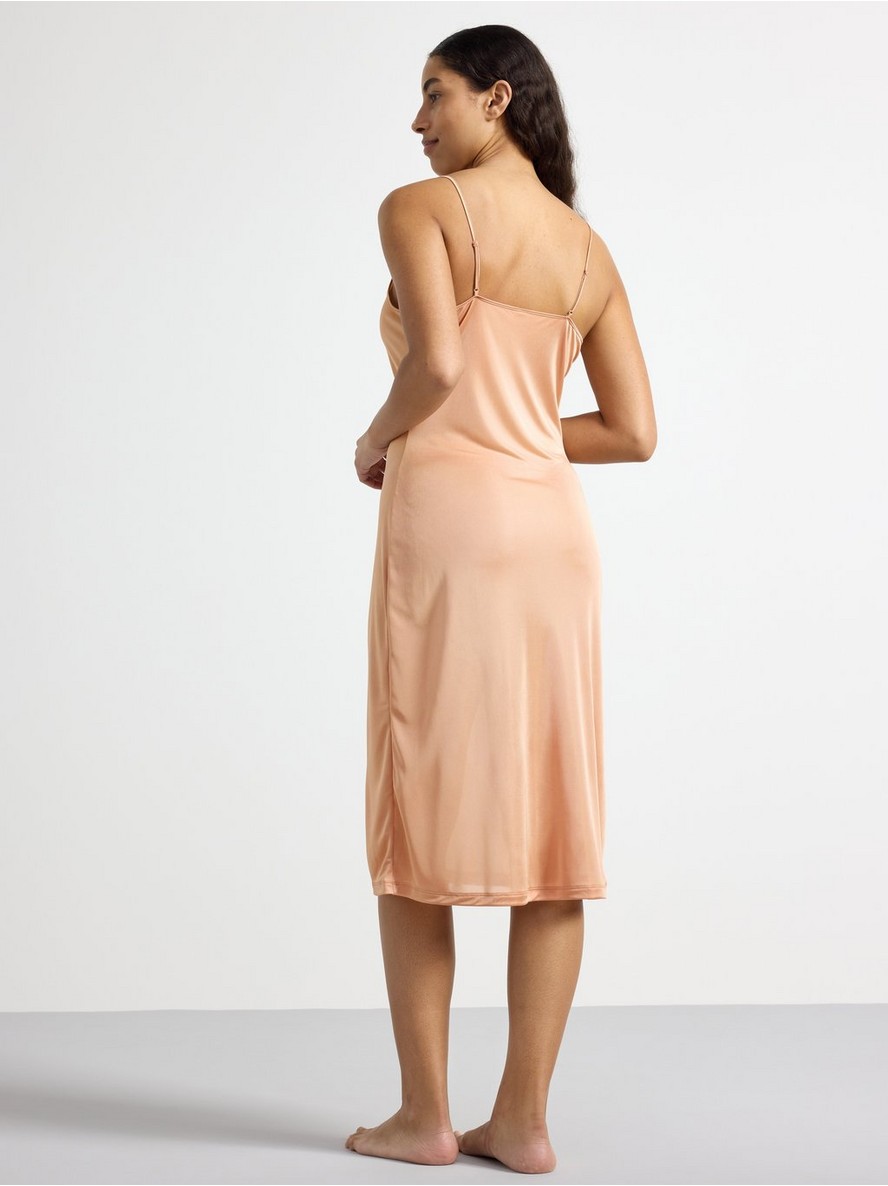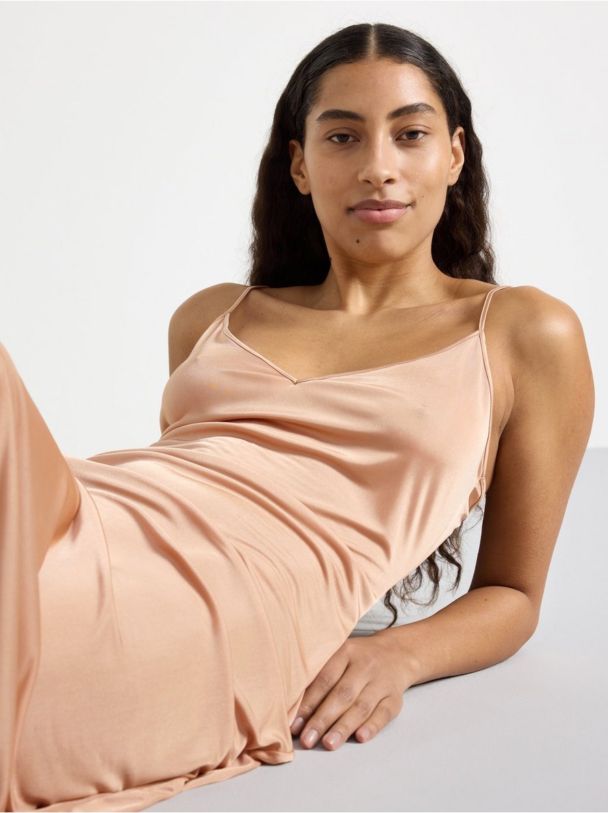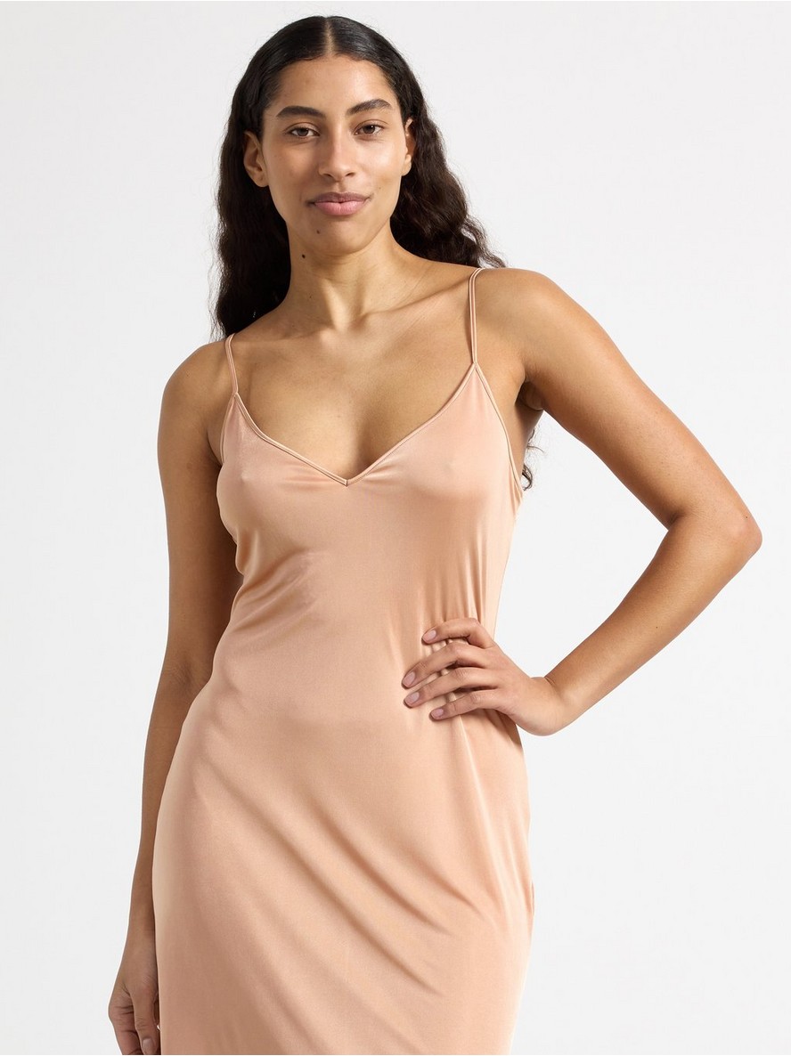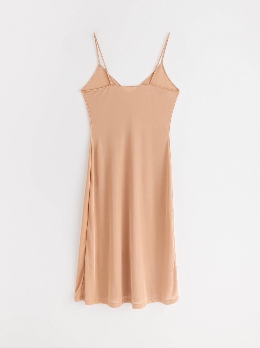Mekana, sjajna slip haljina od antistatičkog materijala sa dubokim V-izrezom i tankim naramenicama.