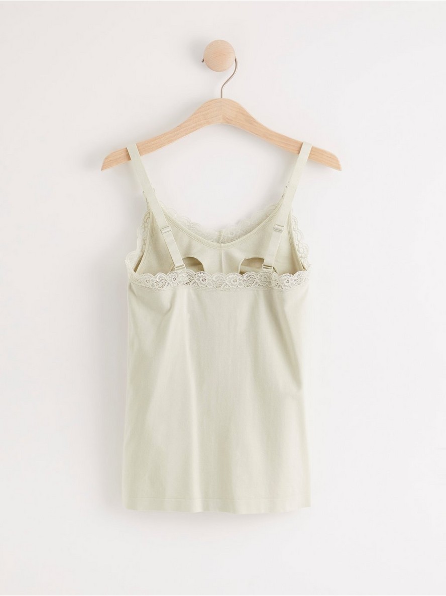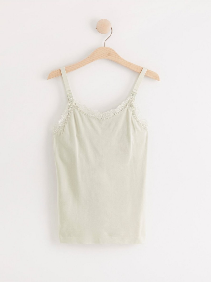 Top za dojenje sa jednostavno spuštajućim košaricama i mekanom, bešavnom izradom koja vam omogućava da ostanete udobni tokom celog dana. Ima udoban unutrašnji okvir za veću podršku i pokrivenost prilikom dojenja. Sa mekanim V-izrezom i čipkastim nazubljenim obrubom. Tkanina je napravljena od 83% TENCEL™ modala, održivije opcije u poređenju sa konvencionalnim modalom.
