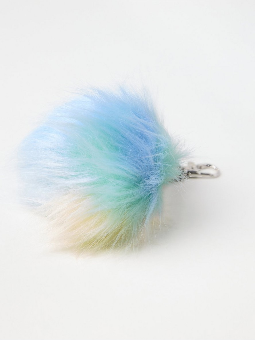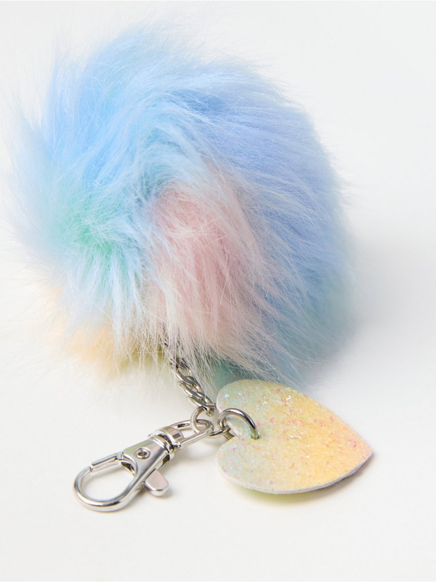 Pufnasti pompon za ukrašavanje torbe sa sjajnim privezakom u obliku srca.