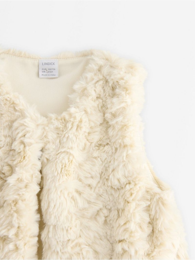 Prsluk od veštačkog krzna sa kopčanjem na kukicu i petlju sprijeda.
