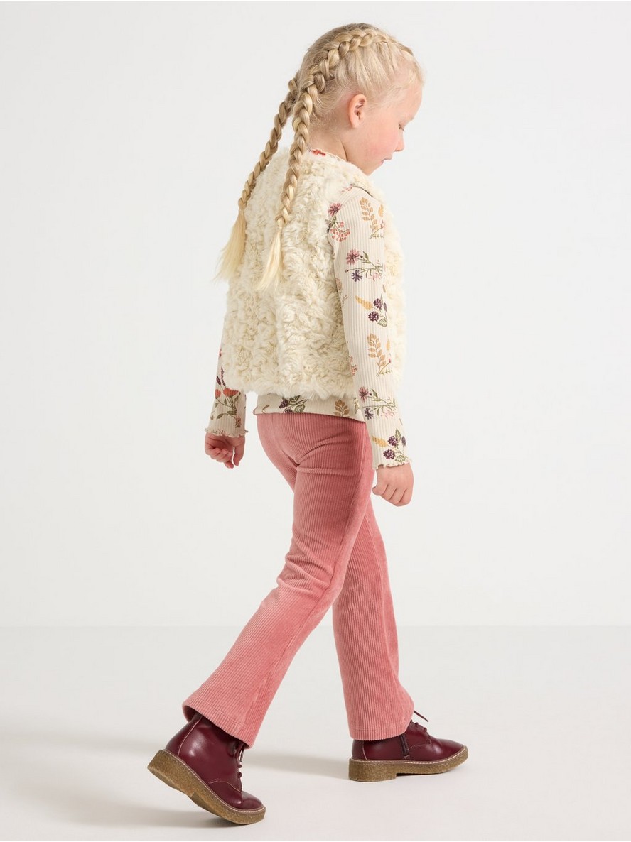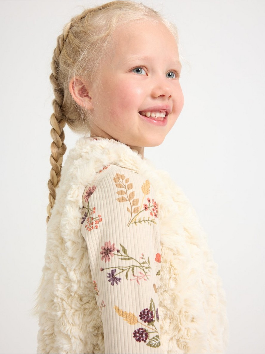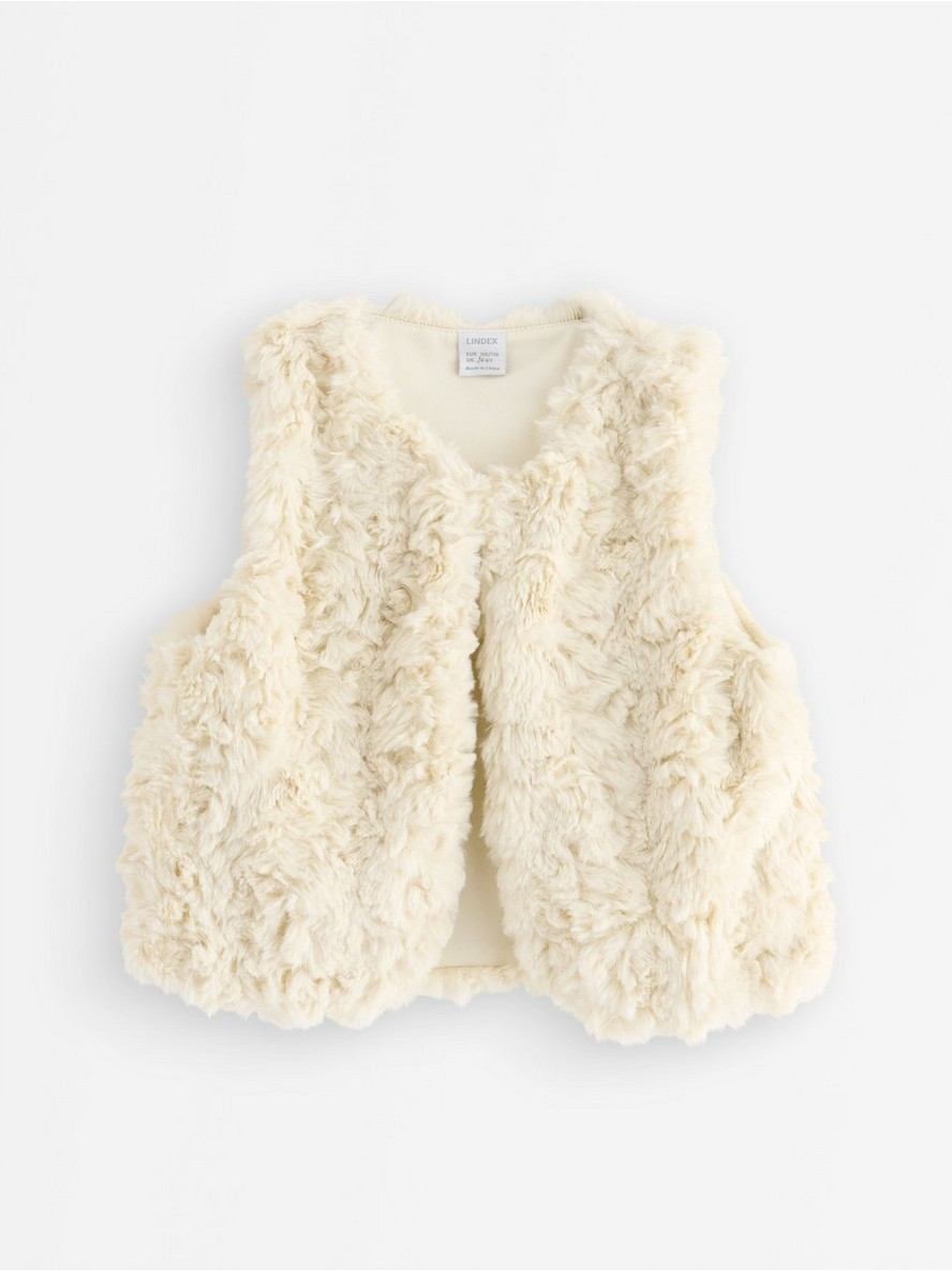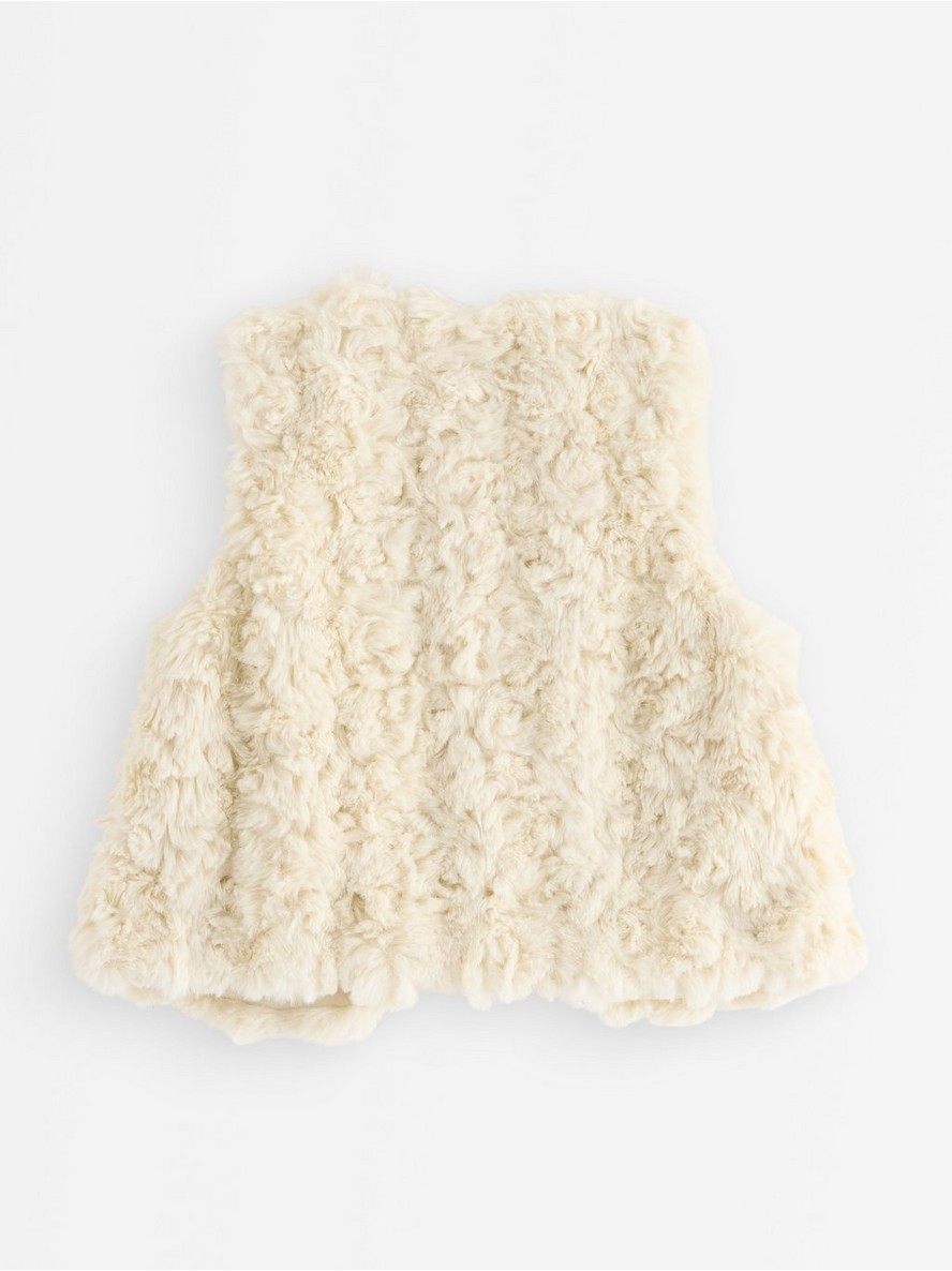 Prsluk od veštačkog krzna sa kopčanjem na kukicu i petlju sprijeda.