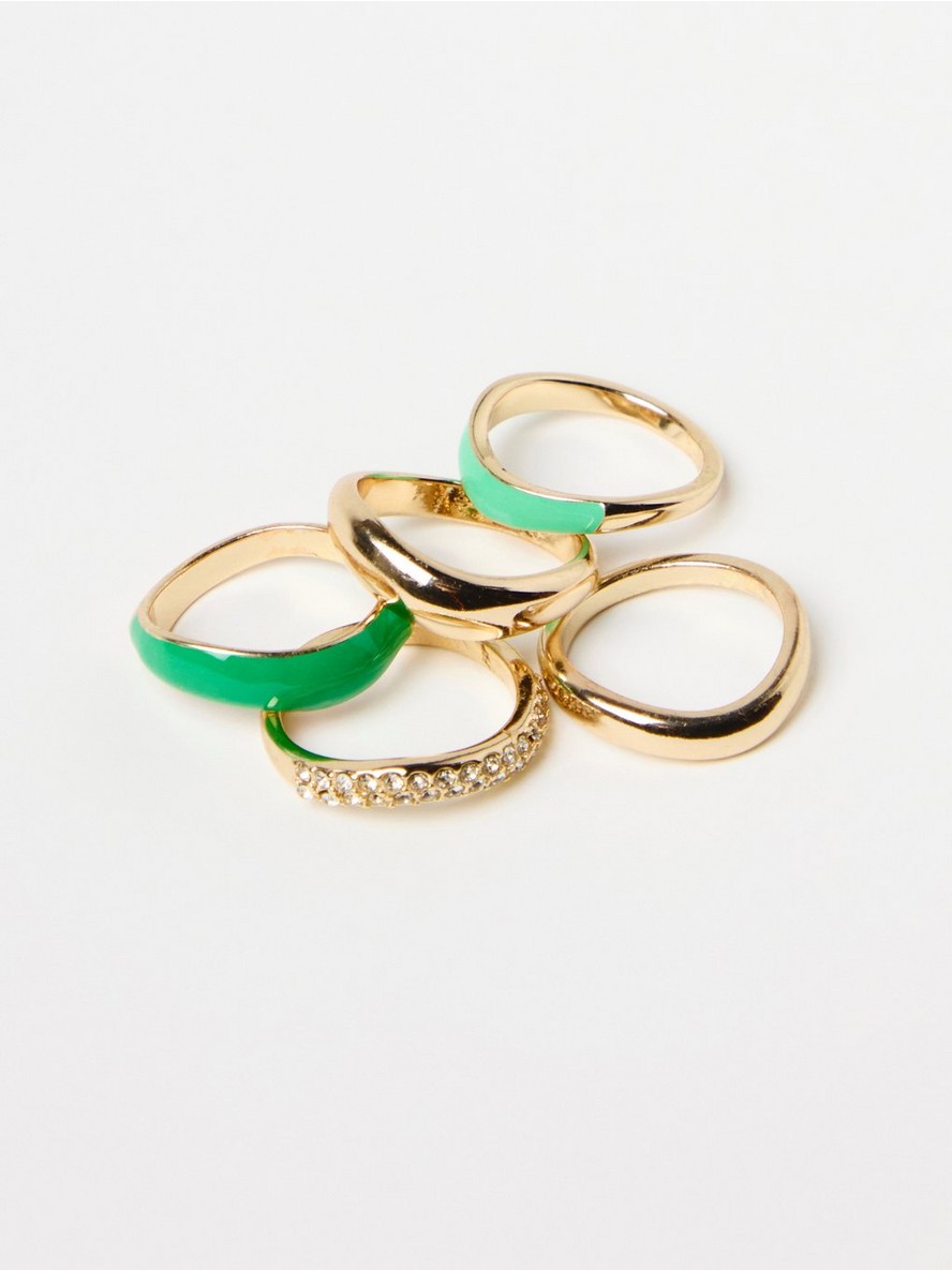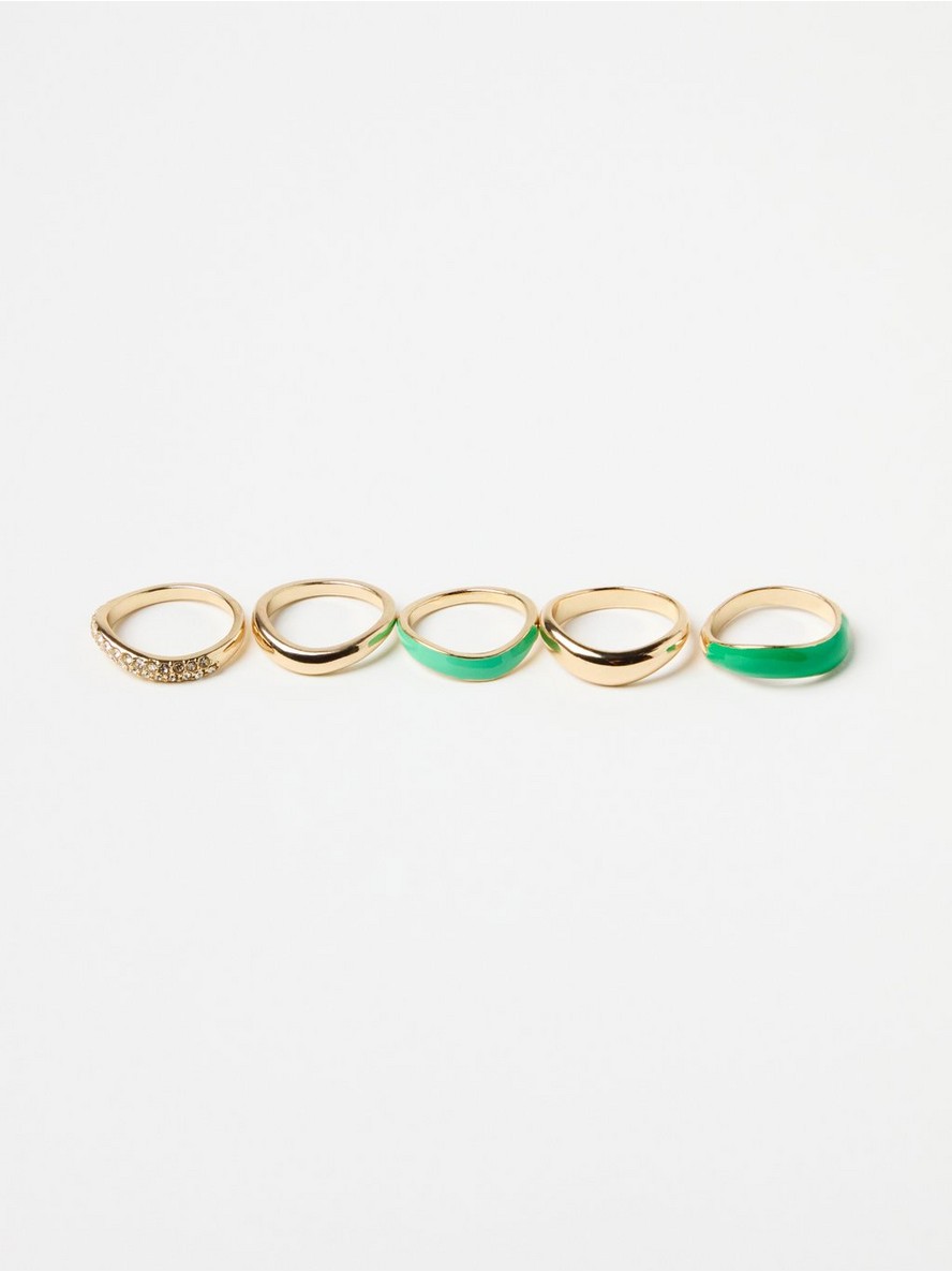 Paket od pet prstenova od metala zlatne boje, različitih oblika i kontrastnih boja.