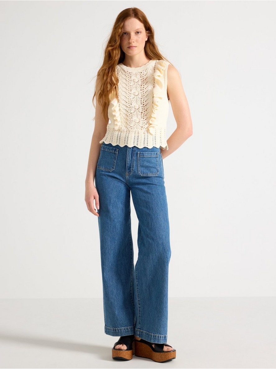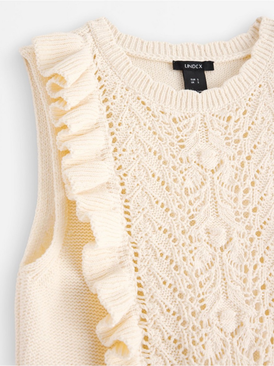 Pleteni prsluk ravnog kroja sa volanima sprijeda.