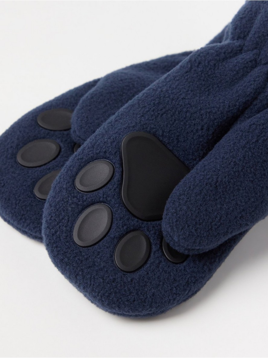 Soft mittens in fleece fabric with cute rubber paws on the palm of the hands.