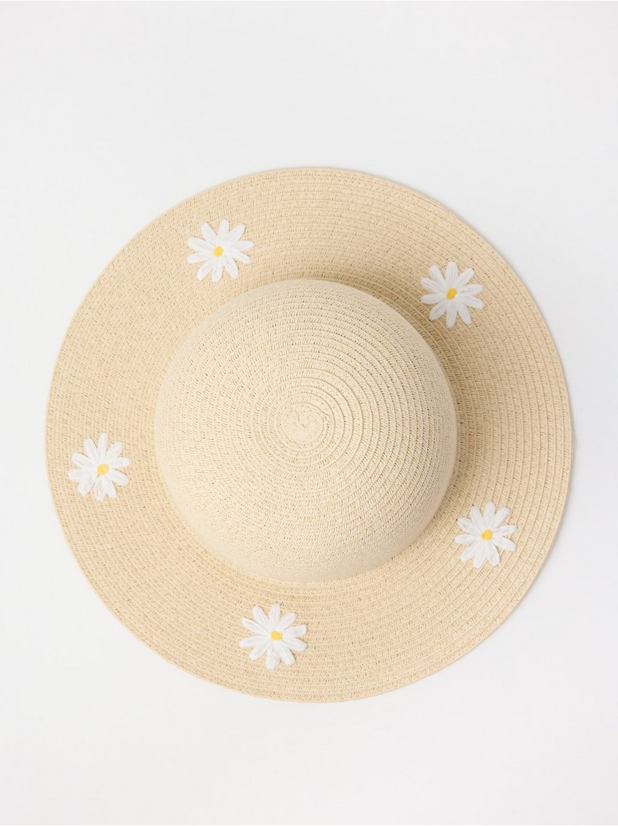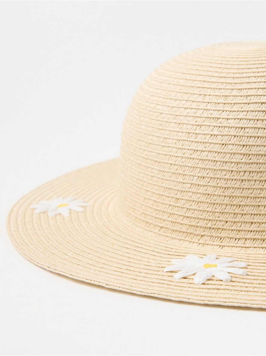 Sunčani šešir od papirne slame sa dekorativnim tratinčicama.