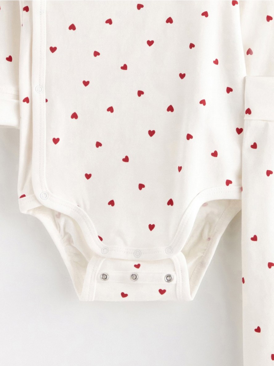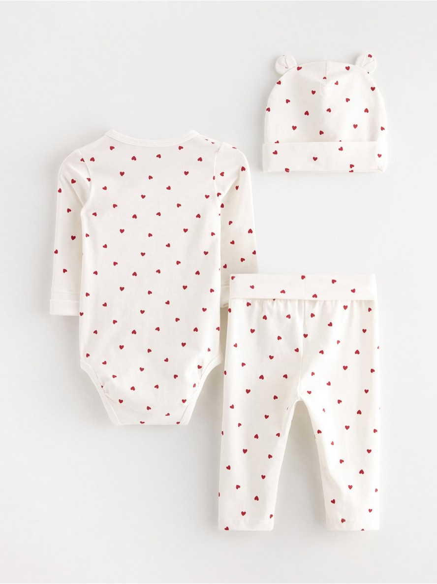 Usklađeni set od mekanog pamučnog džersija koji sadrži preklopni bodi sa dugim rukavima, tajice sa preklopivim pojasom i kapicu. Zahvaljujući našem pametnom Extended size rešenju, beba može da poraste za jednu veličinu, a da i dalje nosi isti komad.
