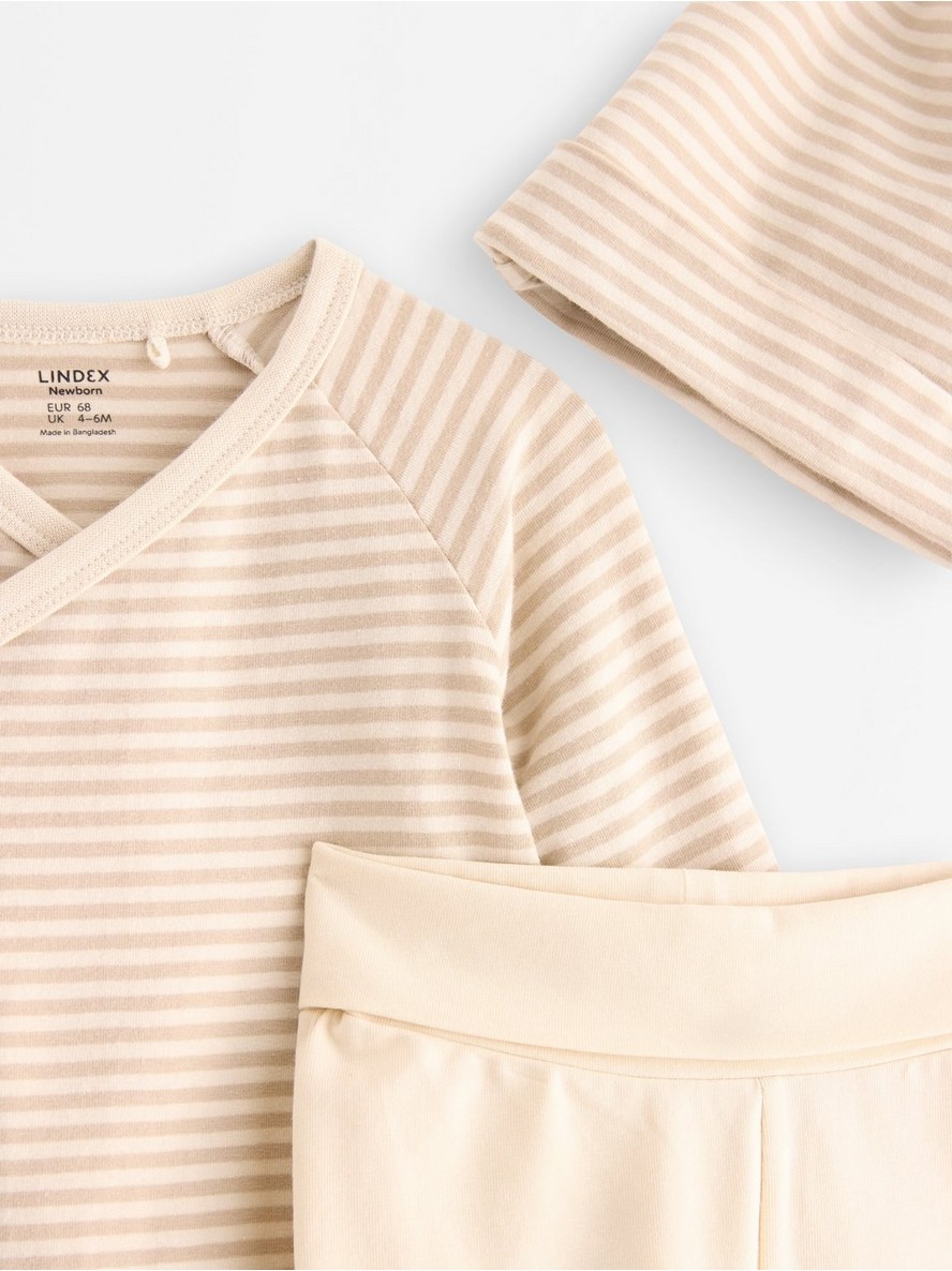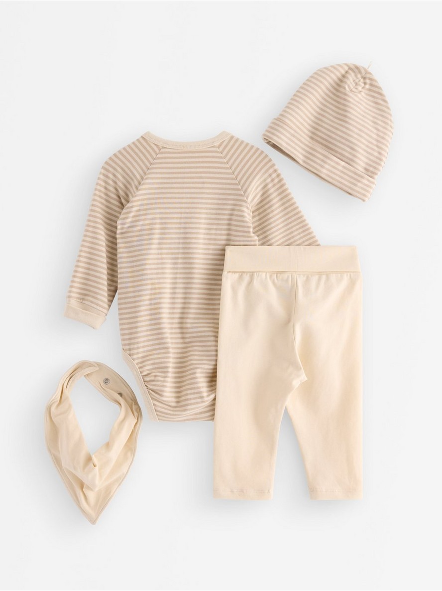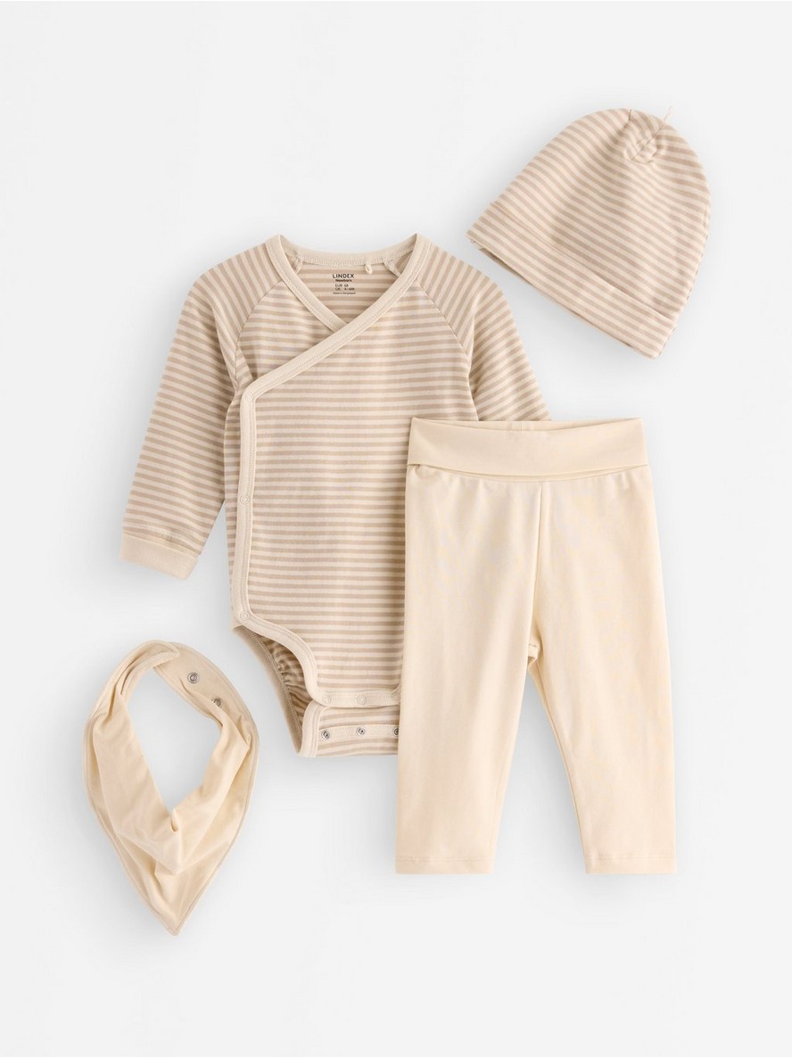 Usklađen, mekan početni komplet za bebu od organskog pamuka sa preklopnim bodijem i tajicama. Zahvaljujući našem pametnom rešenju Extended size, beba može porasti za jednu veličinu, a i dalje zadržati isti komad garderobe.