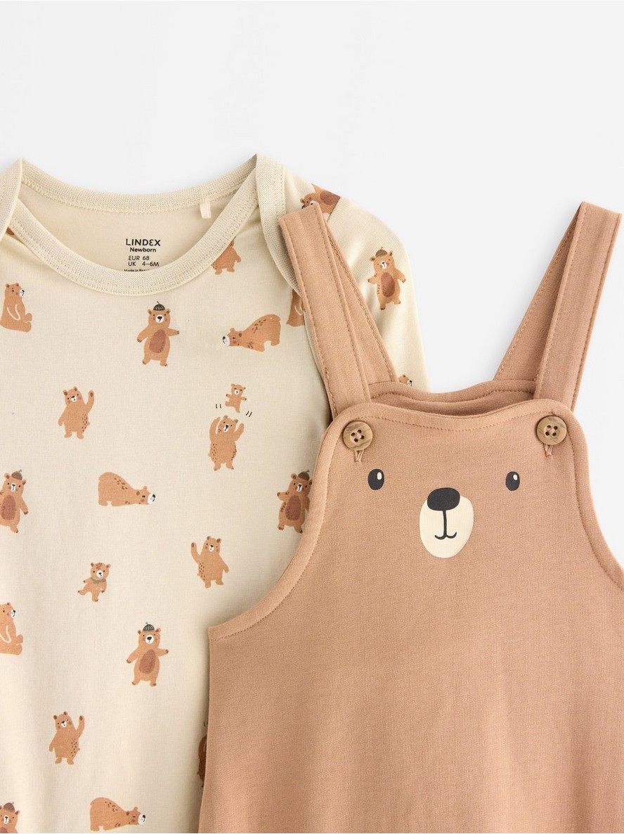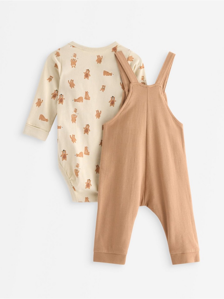 Meki pamučni komplet koji se sastoji od bodija i tregerica. Sa našim pametnim „Extended size“ rešenjem beba može porasti za jednu veličinu, a da i dalje nosi isti komad odeće.