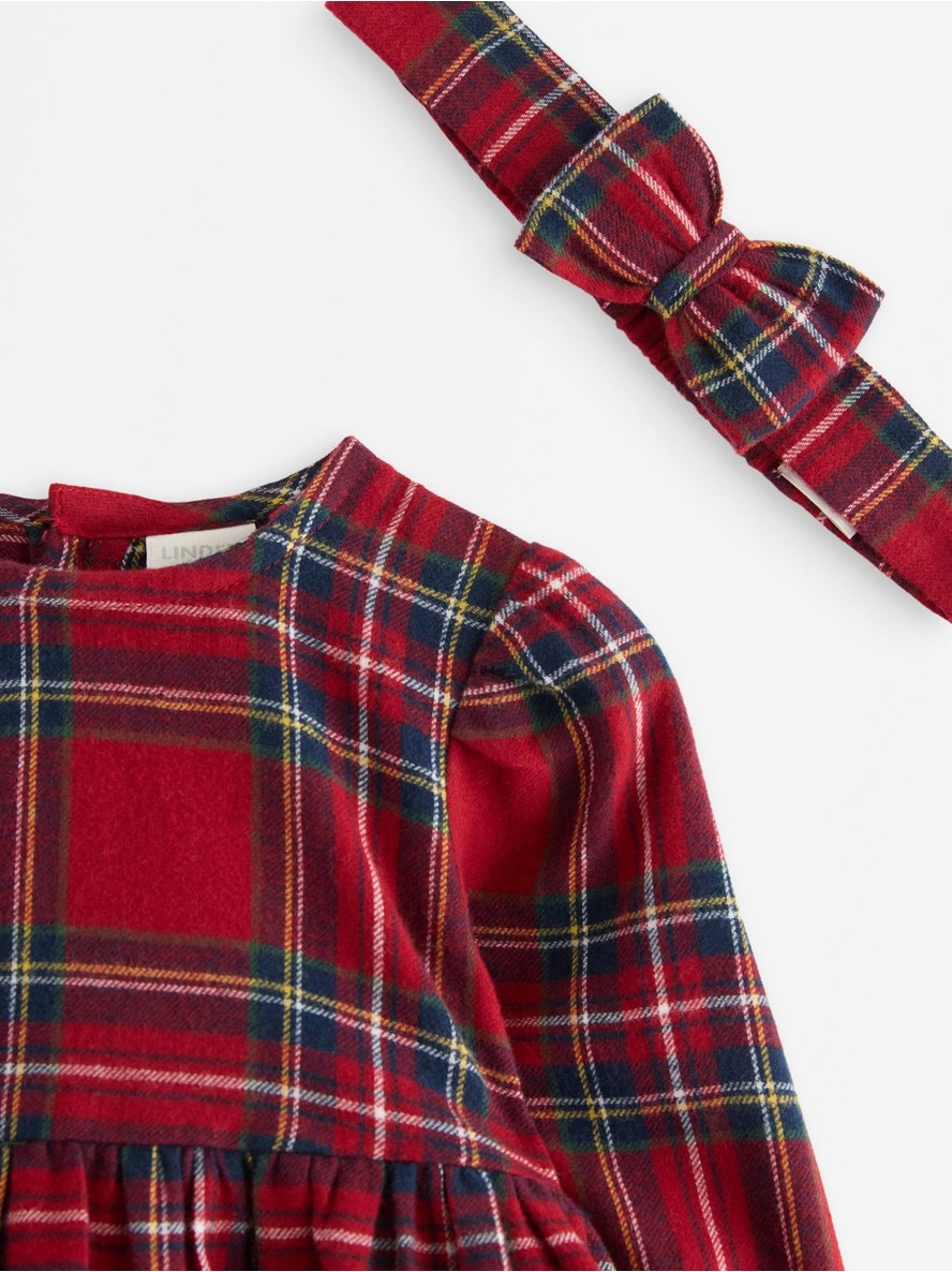Komplet sa kariranom haljinom od mekanog, udobnog pamuka i usklađenom trakom za kosu.