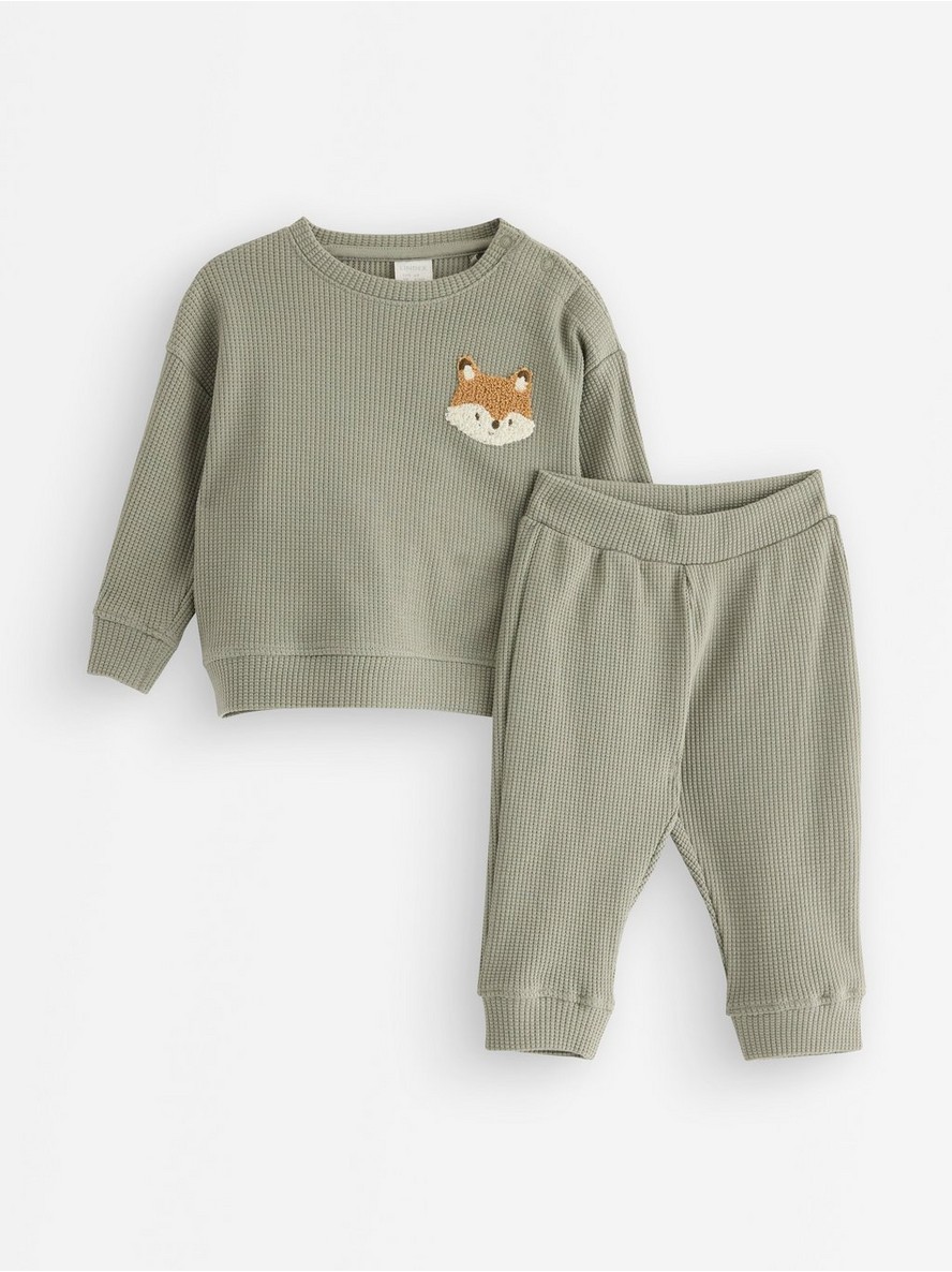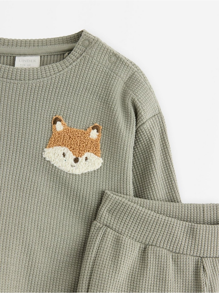Komplet sa vafl strukturom i aplikacijom na grudima. Donji deo (joggers) sa mekanom gumom u struku.