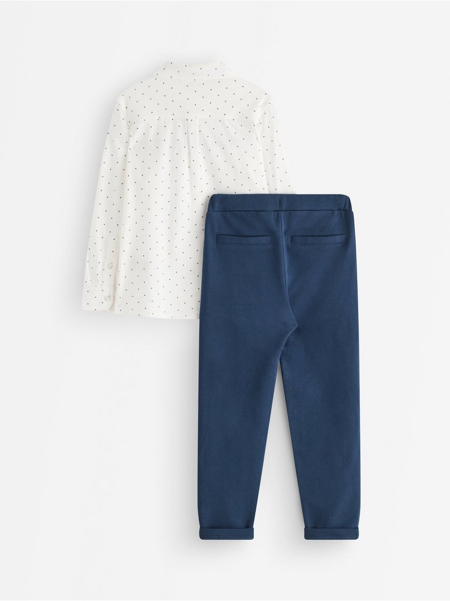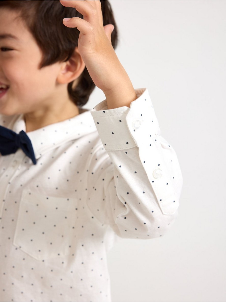Ovaj mekani komplet od pamučnog džerseja uključuje košulju dugih rukava sa odvojivom i podesivom leptir-mašnom i usklađene pantalone sa elastičnim strukom – savršen za svečanije dane, uz mekan i opušten osećaj.