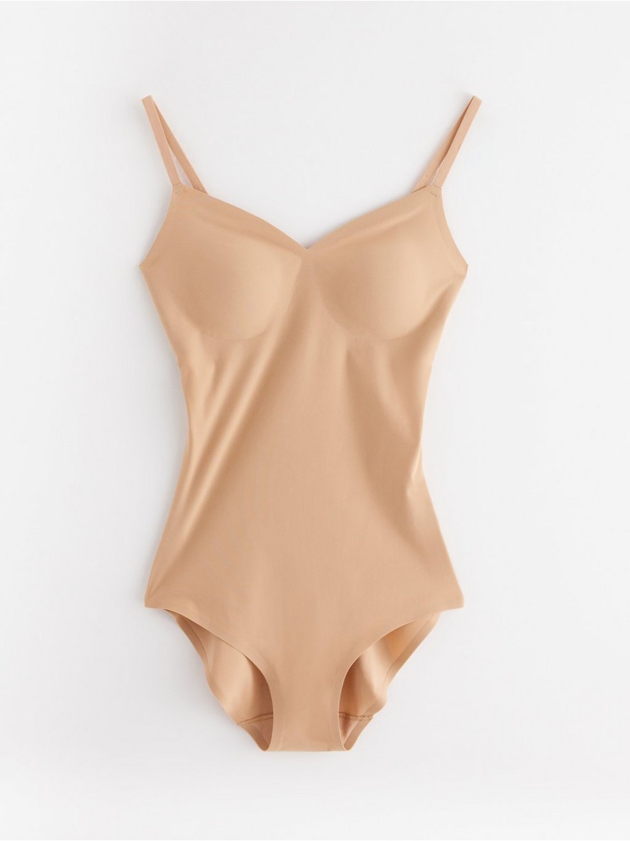 Bodi koji oblikuje figuru sa srednjom potporom, oblikovanim korpicama i podstavljenim međunožjem bez kopči, koji ističe vašu siluetu bez narušavanja udobnosti.