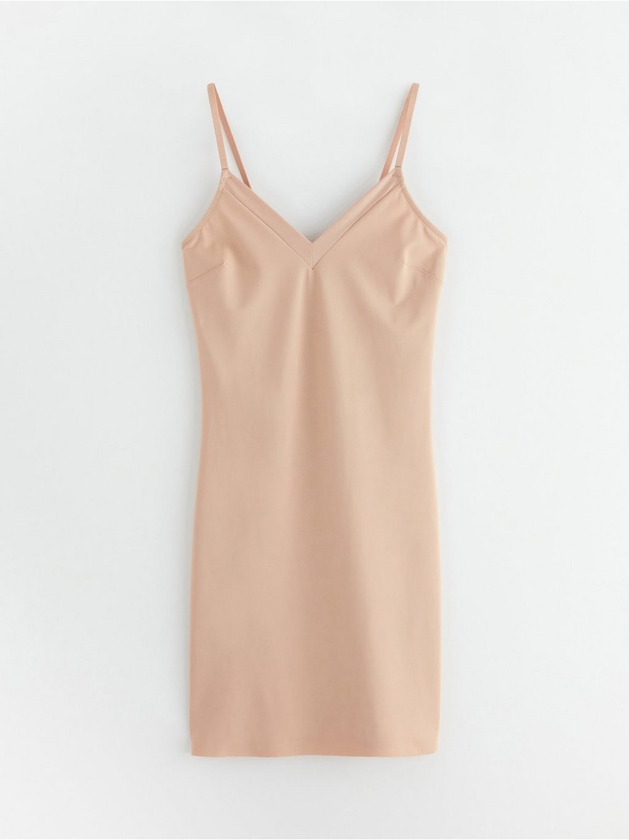 Istaknite siluetu bez ugrožavanja udobnosti uz ovu oblikujuću haljinu. Elastični materijal oblikuje figuru, a haljina ostaje na mestu tokom celog dana zahvaljujući silikonskoj traci na unutrašnjoj strani donjeg ruba.