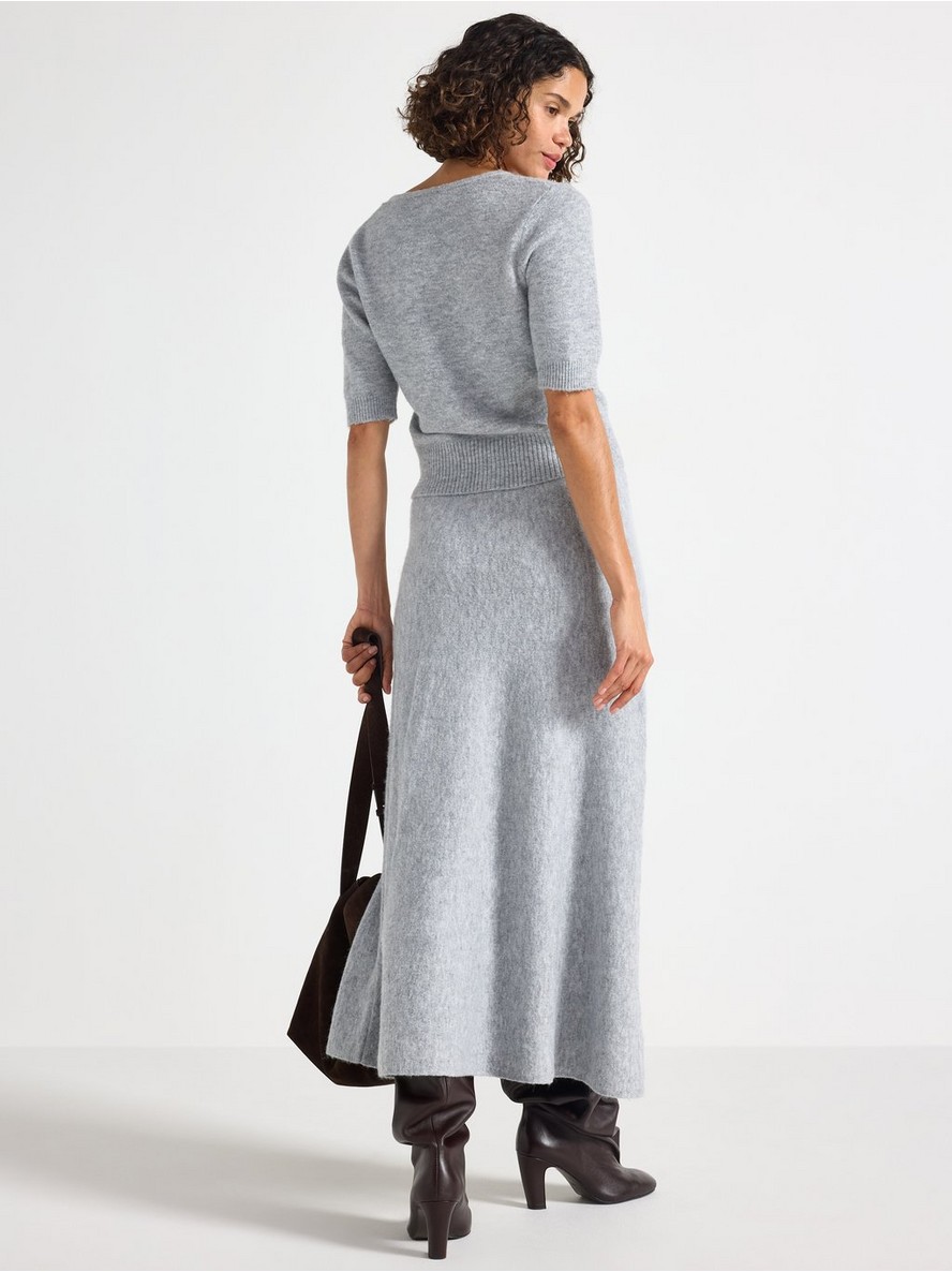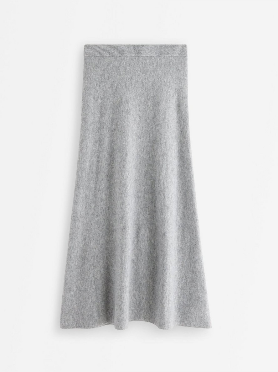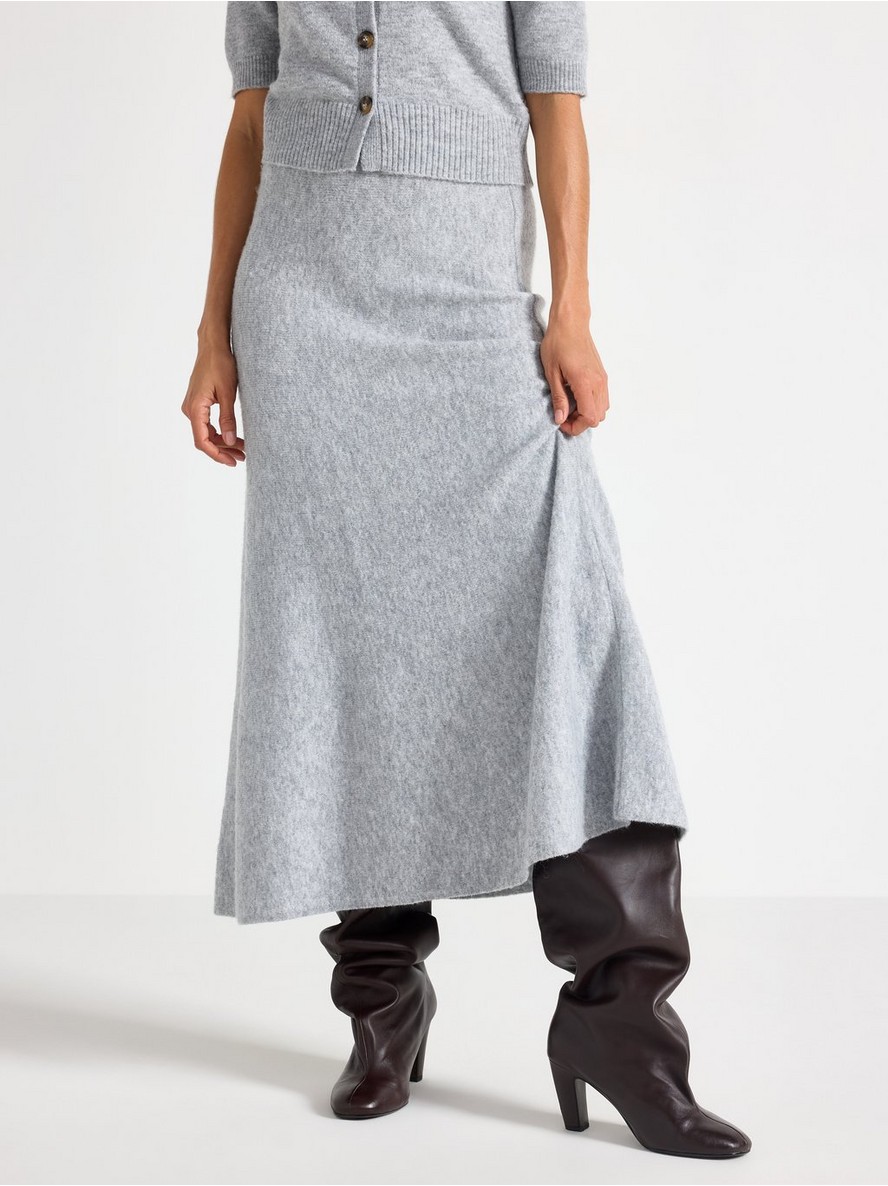 Mekana, fino pletena maxi suknja sa udobnim elastičnim strukom i blago proširenom siluetom.