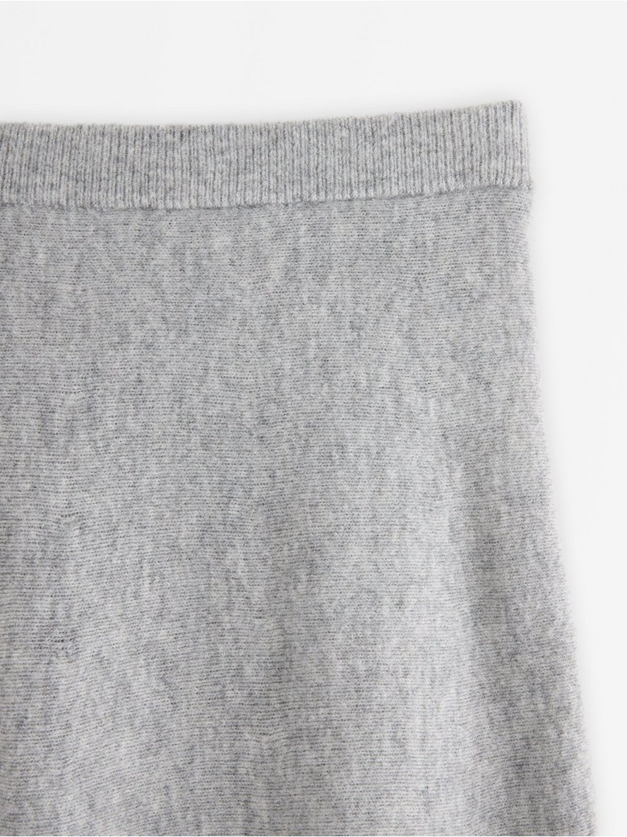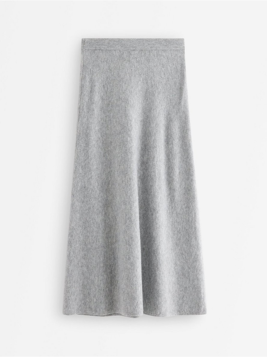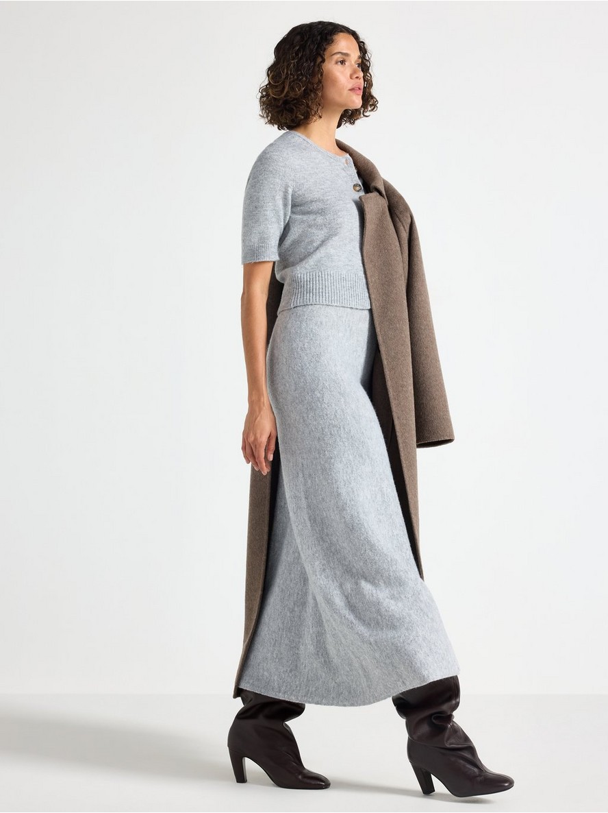 Mekana, fino pletena maxi suknja sa udobnim elastičnim strukom i blago proširenom siluetom.