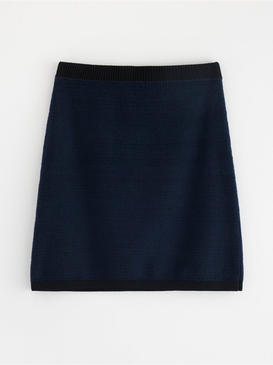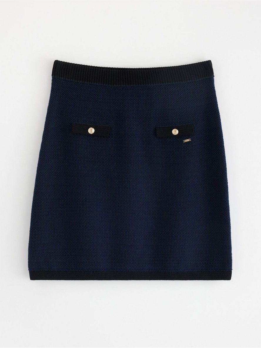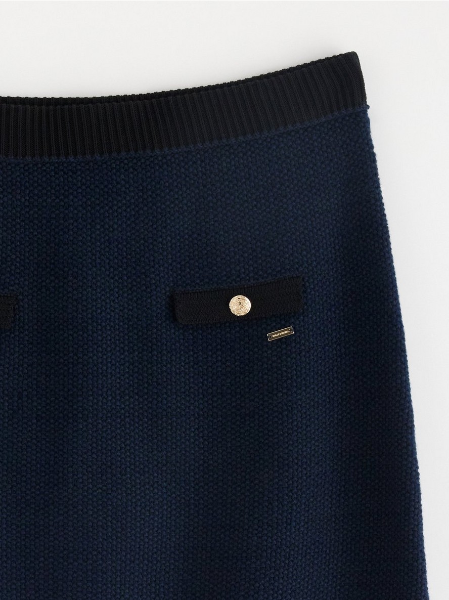 Pletena suknja sa rebrastim pojasom. Dolazi sa lažnim džepovima sprijeda i zlatnim dugmadima.