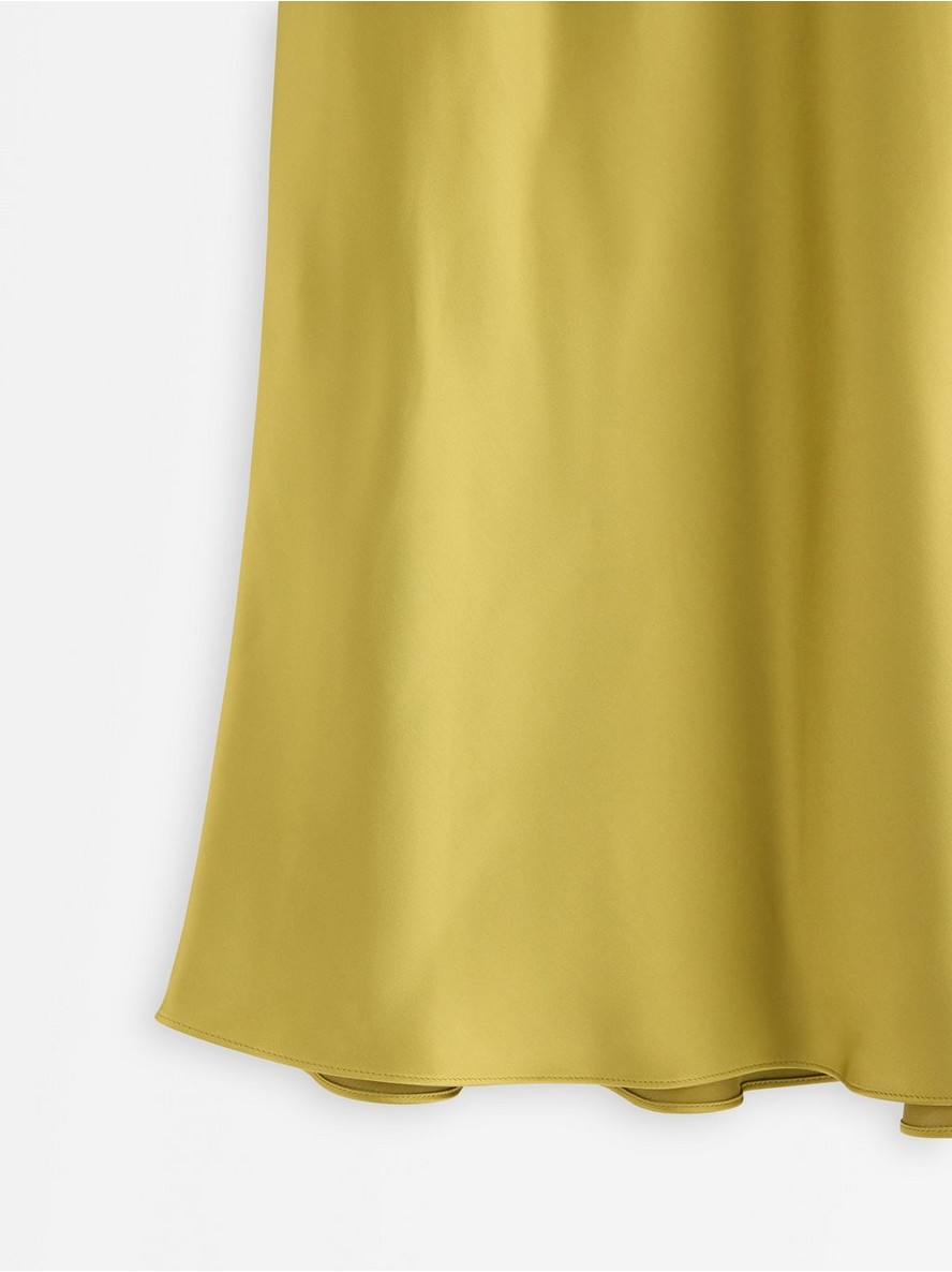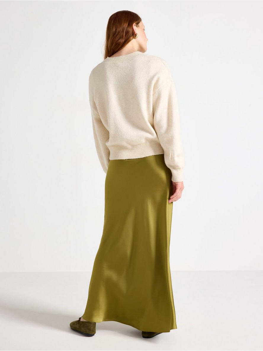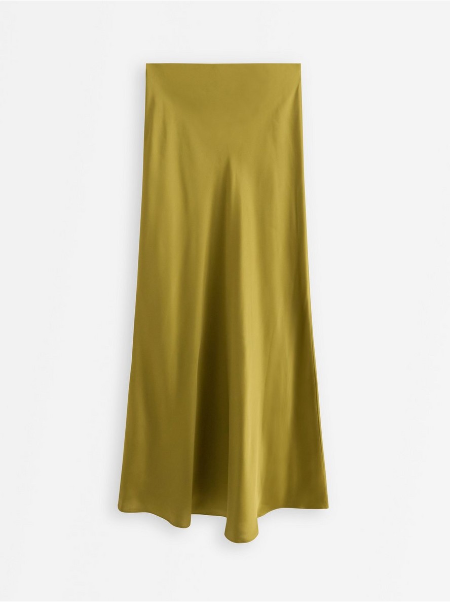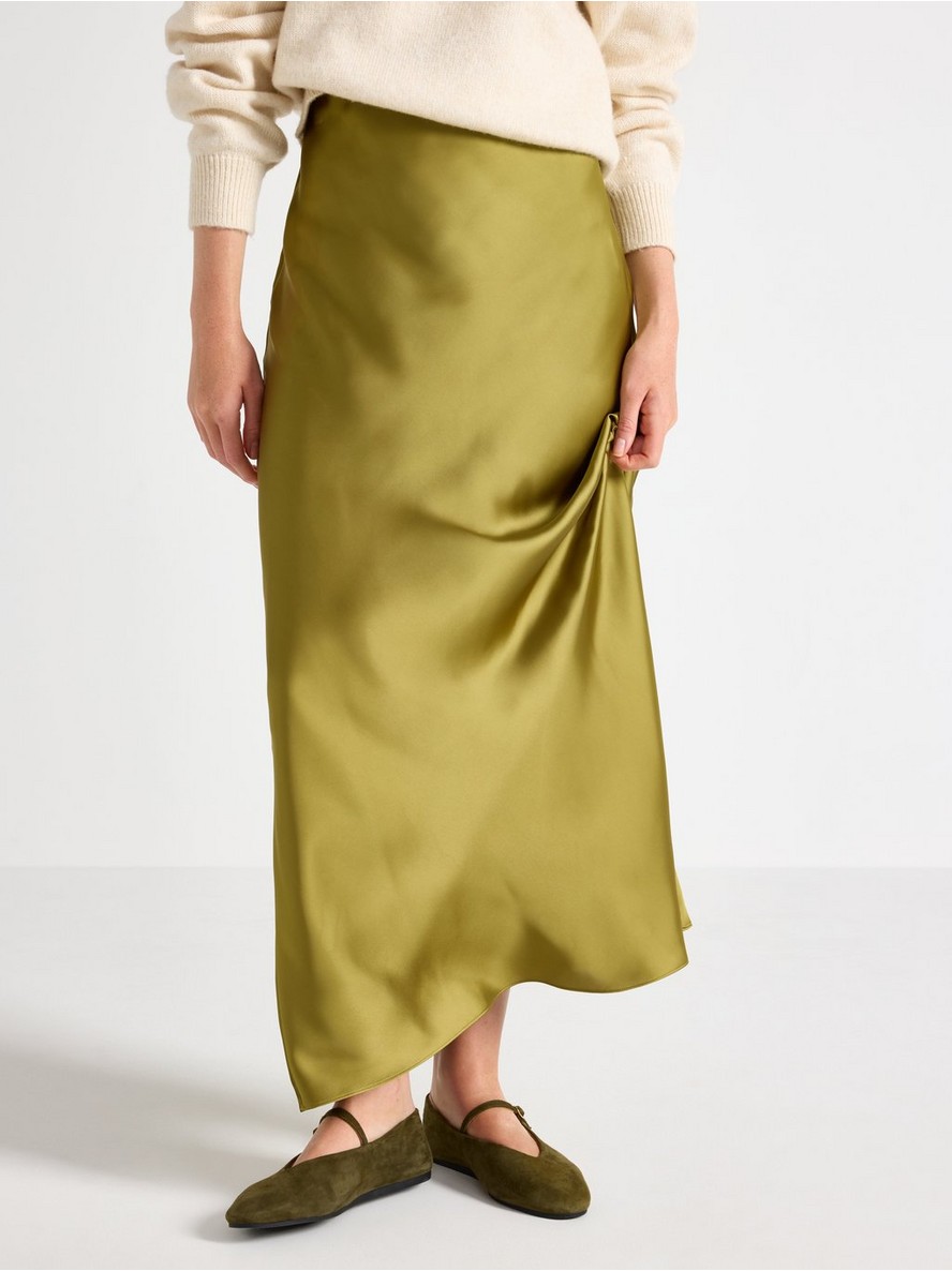 Elegantna maxi suknja od satena sa skrivenim elastičnim pojasom.