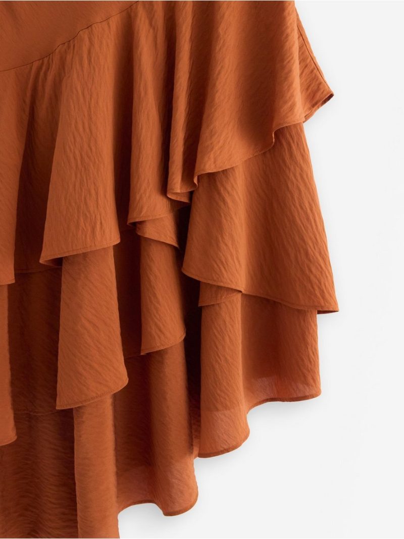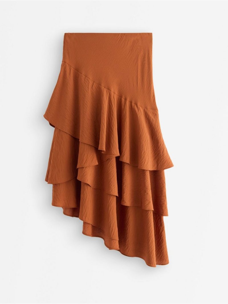 Lepršava midi suknja od mekane viskozne mešavine sa asimetričnim donjim rubom i volanima.