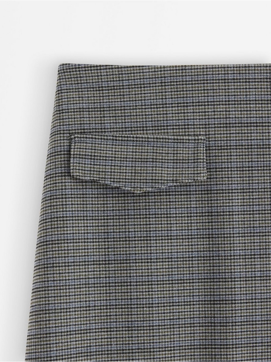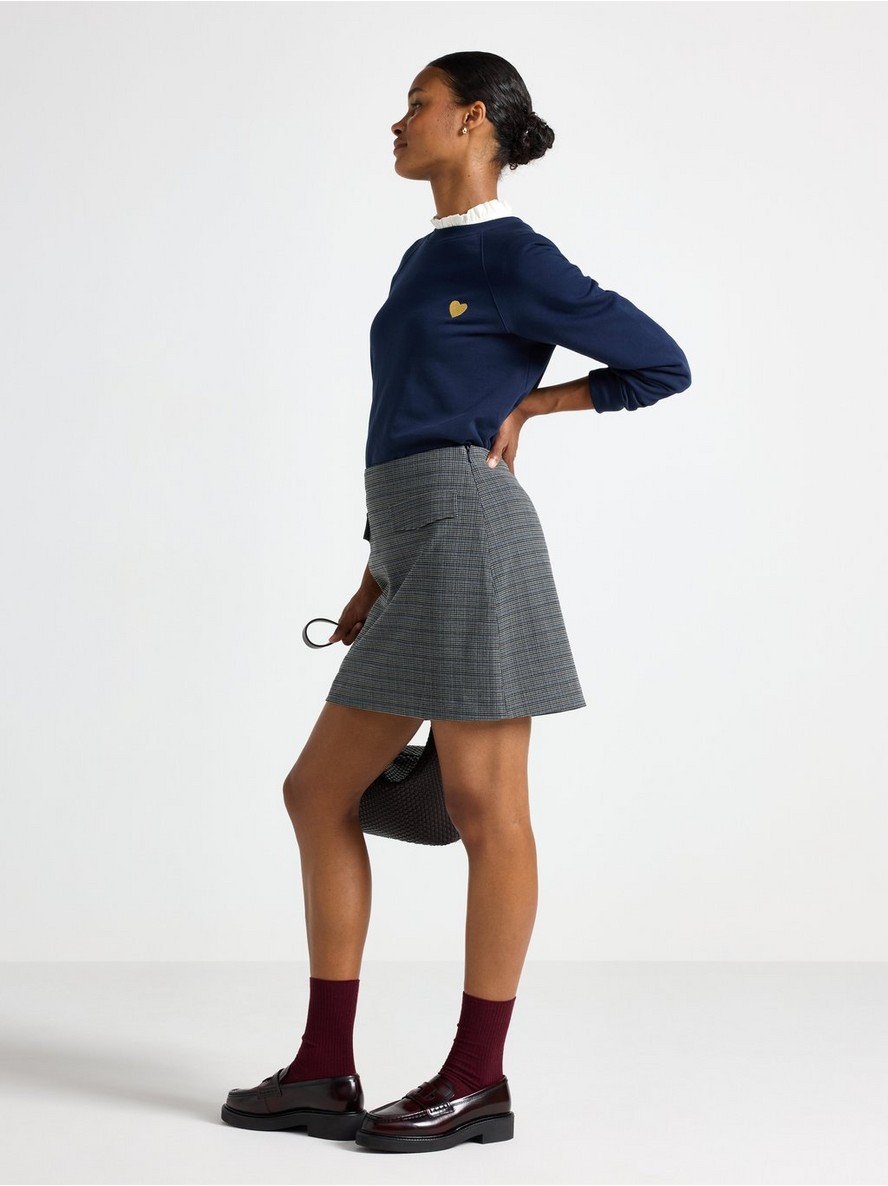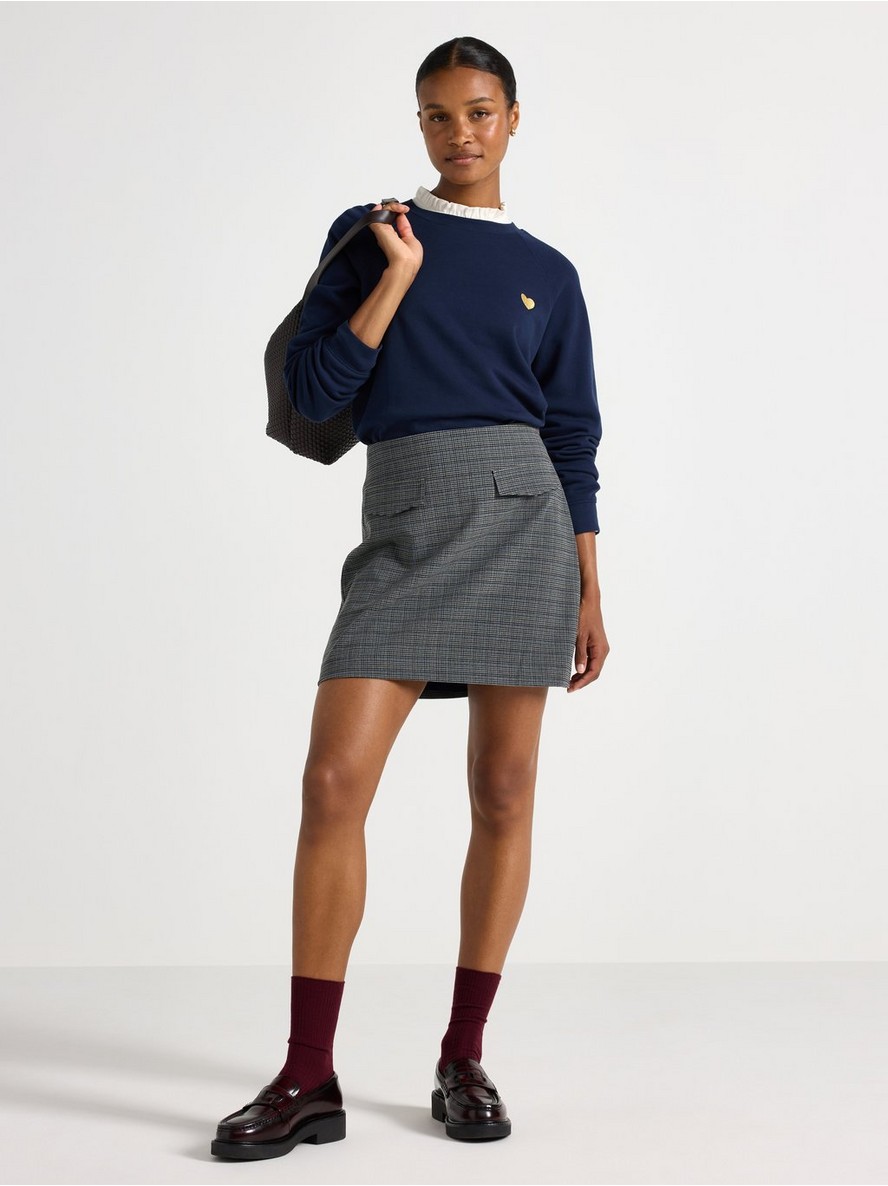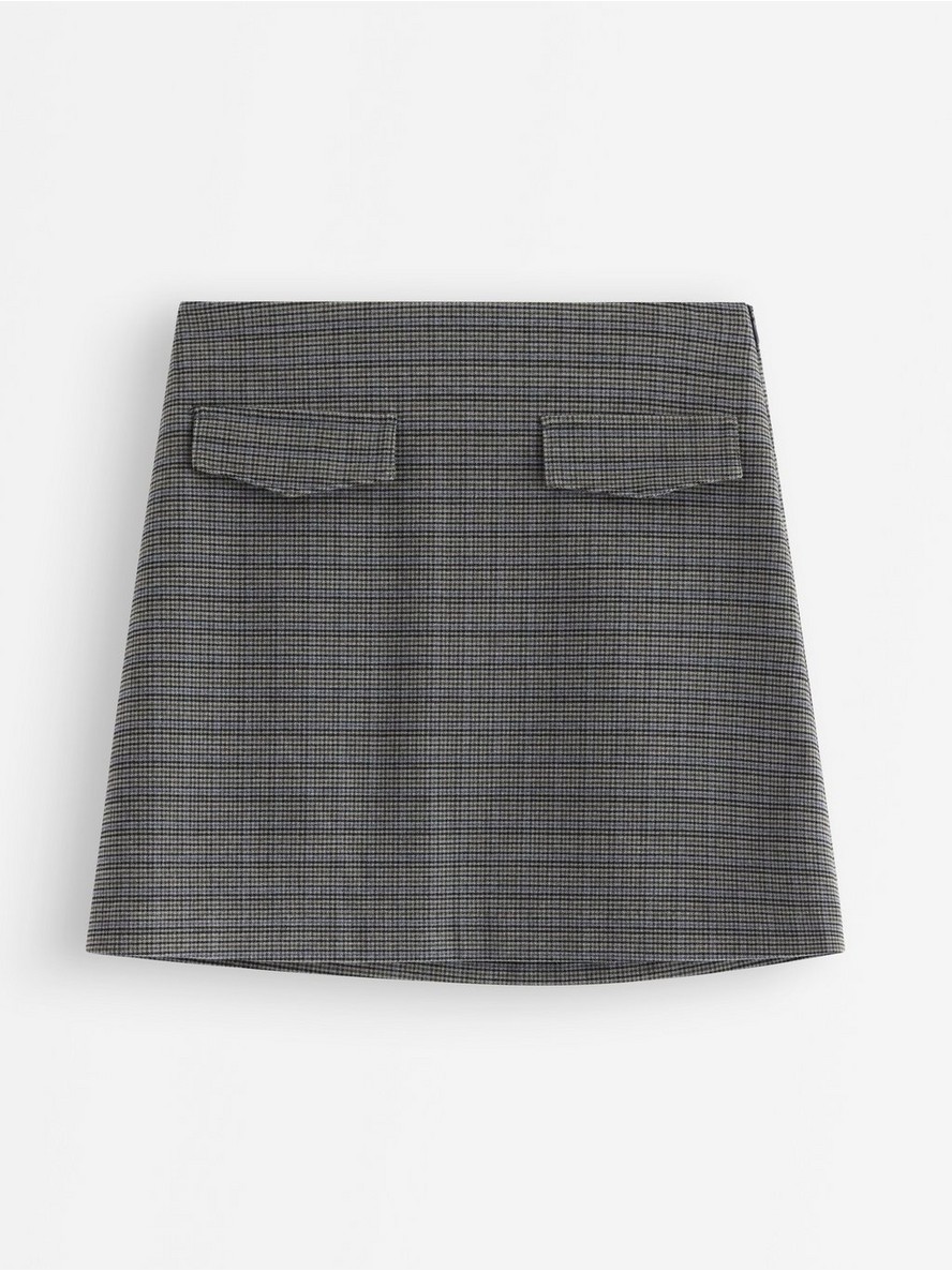 Mini suknja ravnog kroja, sa skrivenim bočnim rajsferšlusom i lažnim džepovima sprijeda.