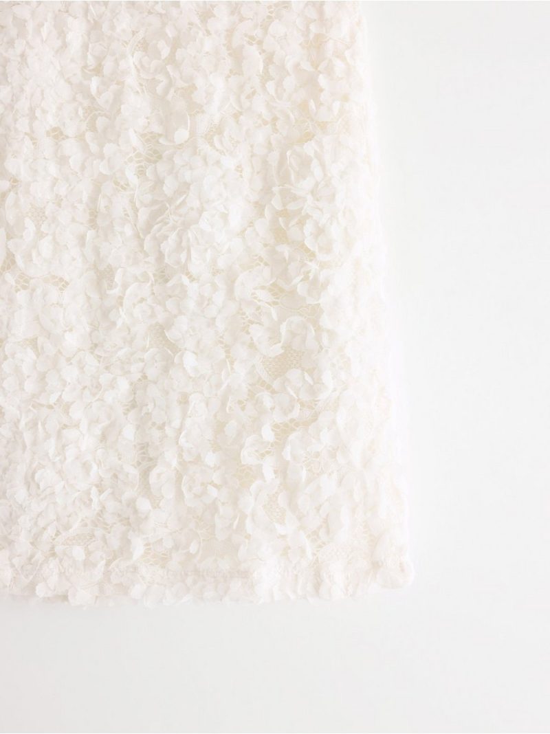 Mini suknja ravnog kroja sa cvetnom čipkom po celoj površini.