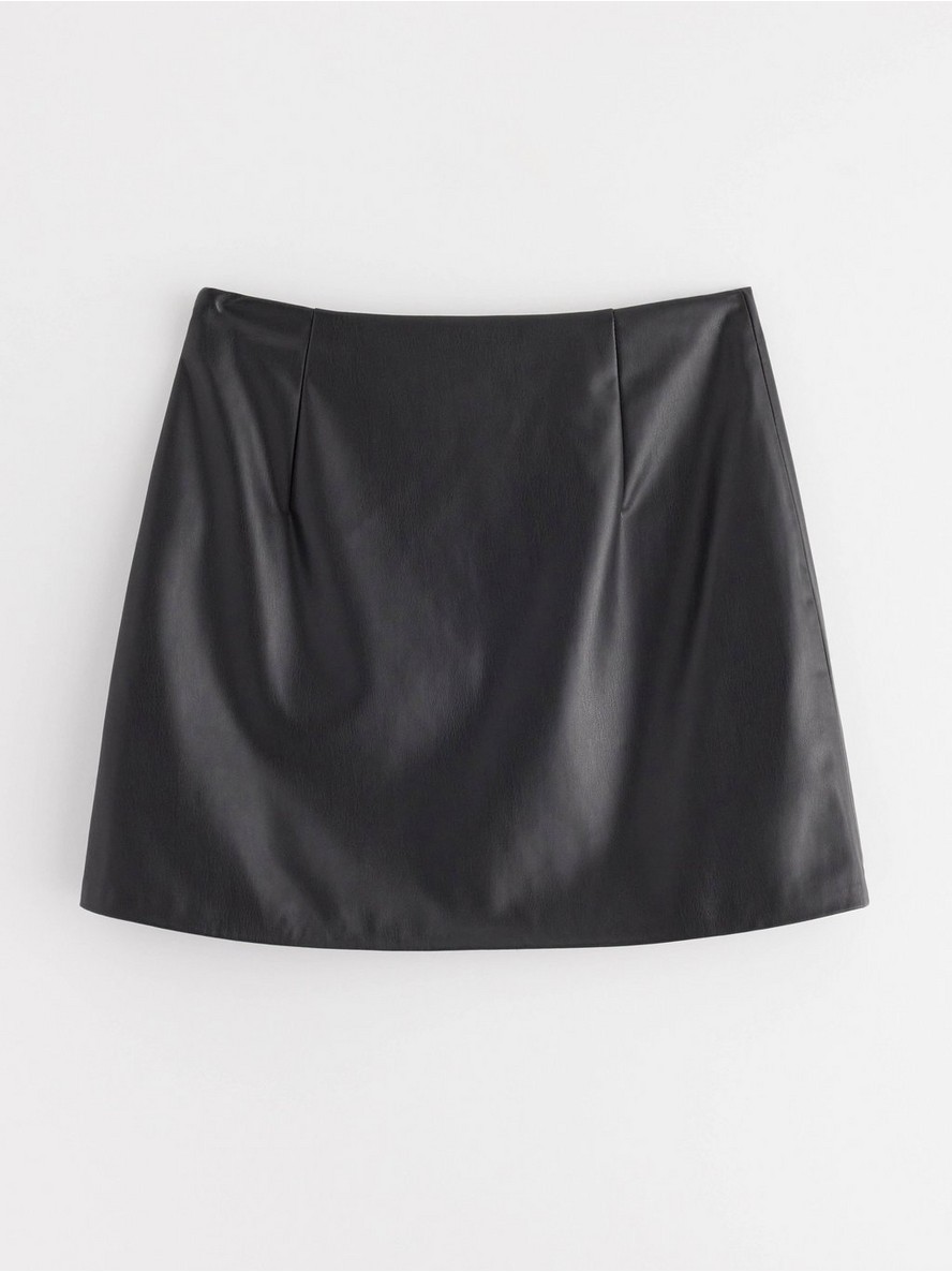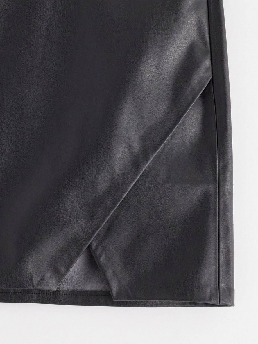 Stilizovana mini suknja od eko-kože sa asimetričnim prorezom i bočnim rajferšlusom.