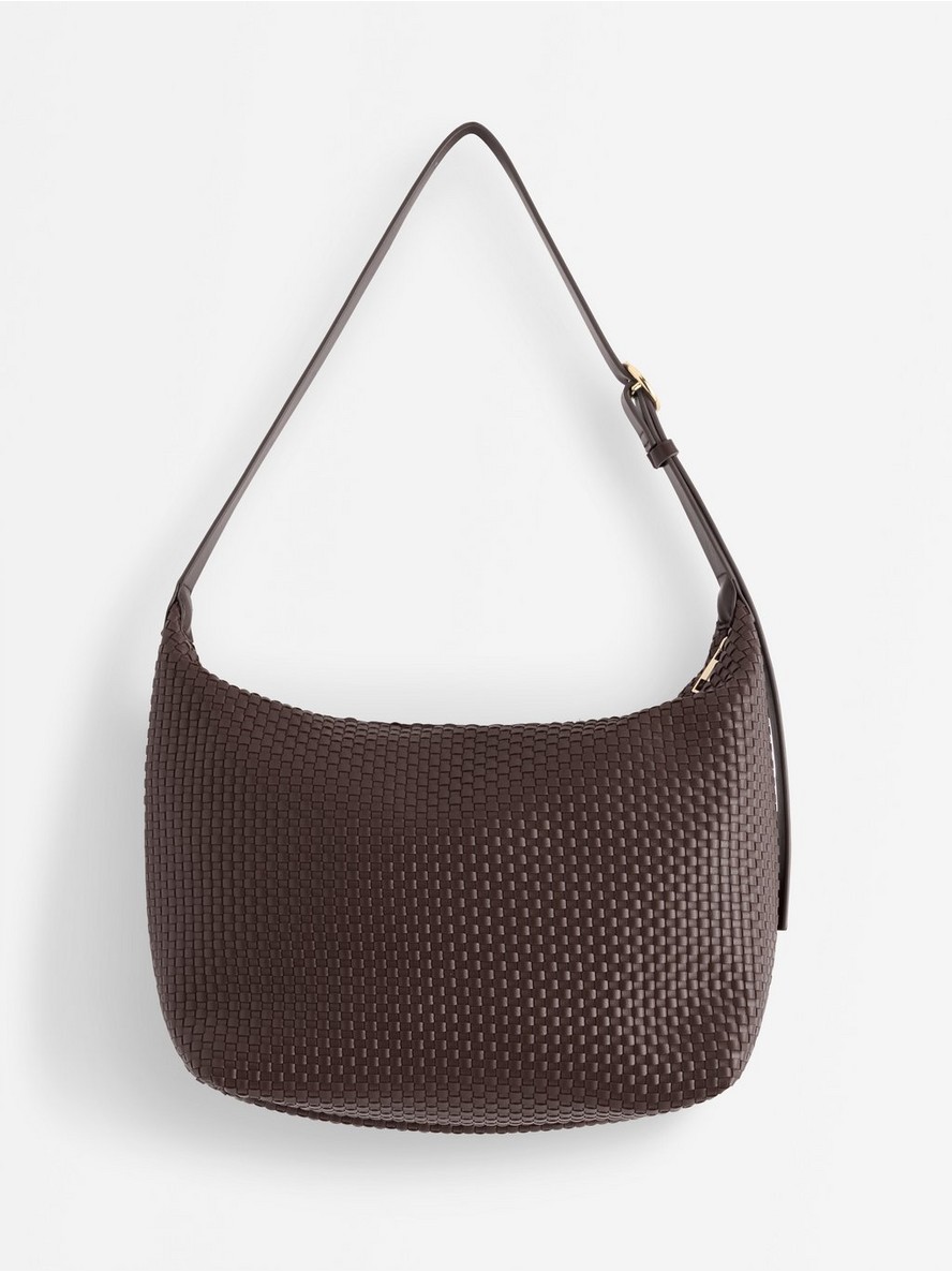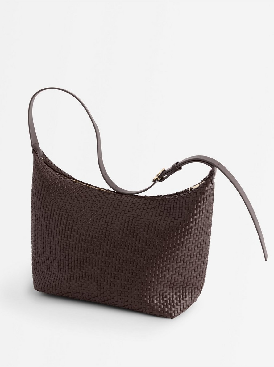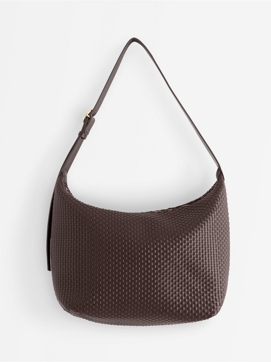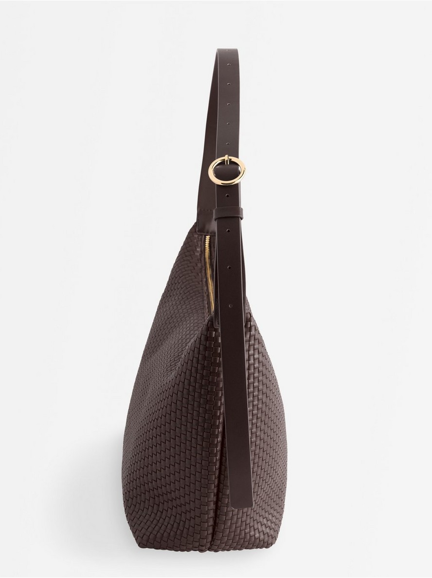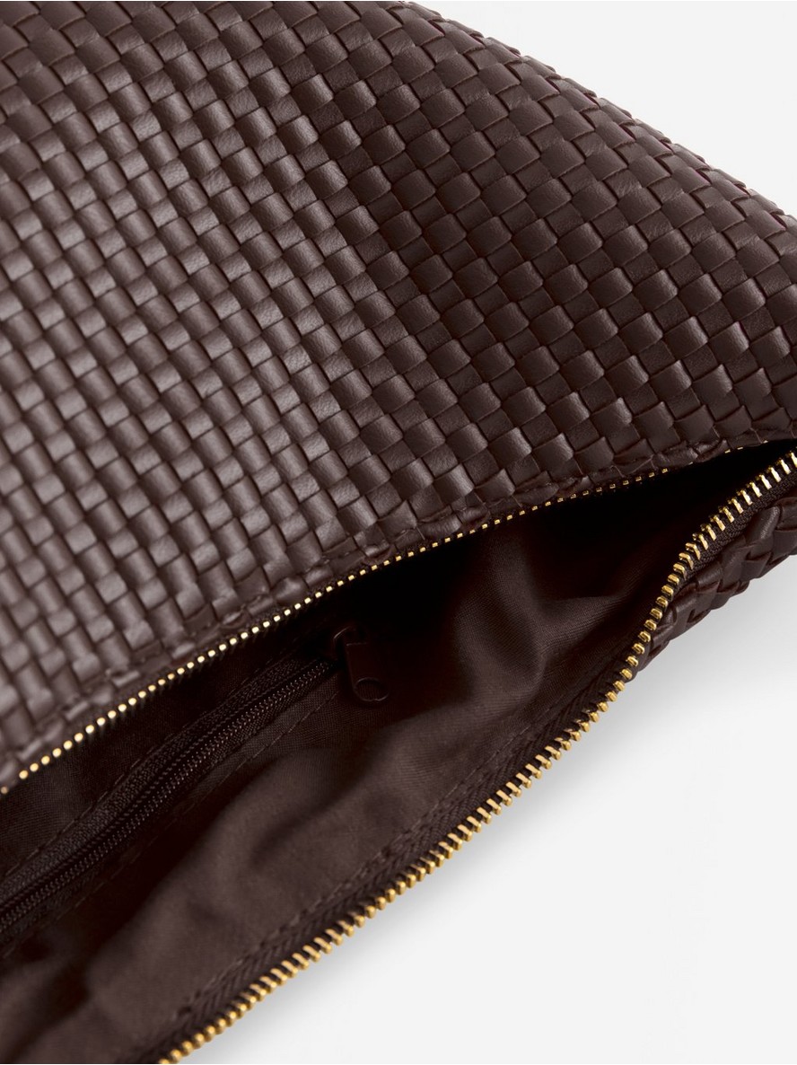 Tašna od imitacije kože sa pletenom strukturom po celoj površini.