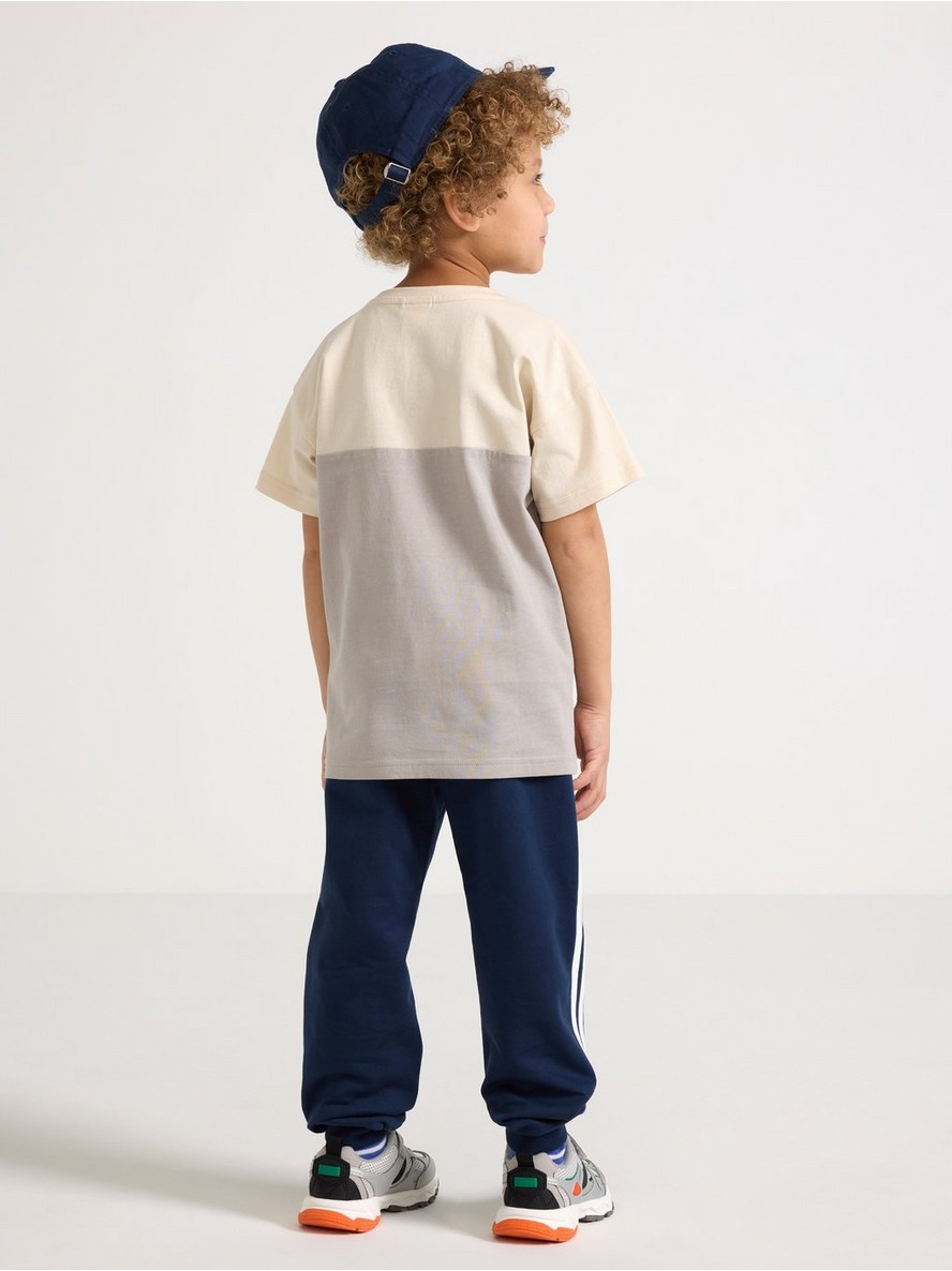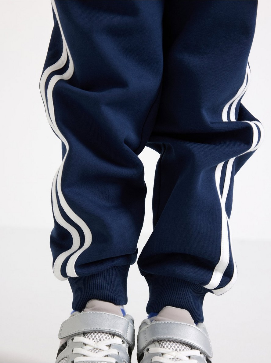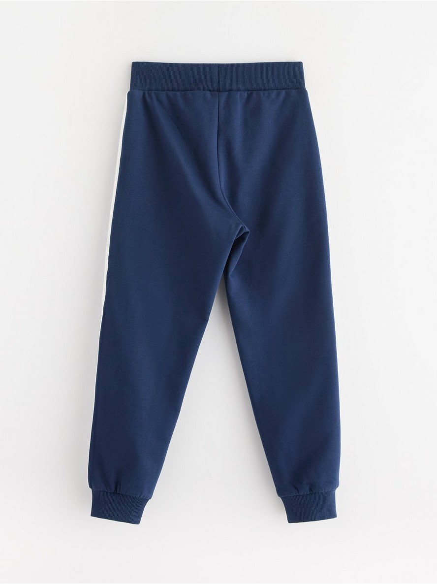 Udobne jogger pantalone od pamučnog dresa sa bočnim prugama duž nogavica i rebrastim elastičnim strukom.